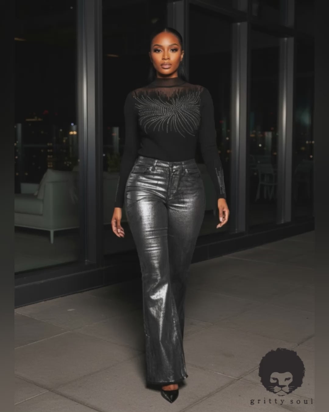 Command the spotlight in the Keyhole Luxe Top — where elegance meets edge. This rib-knit beauty features a mock neckline drenched in rhinestone detailing that cascades down the chest for a cosmic shimmer. The circular cut-out sleeves add that extra dose of drama, giving a peek of skin while keeping it classy and bold — perfect for pairing with sequins, metallics, or denim for a grown-woman statement look.