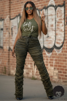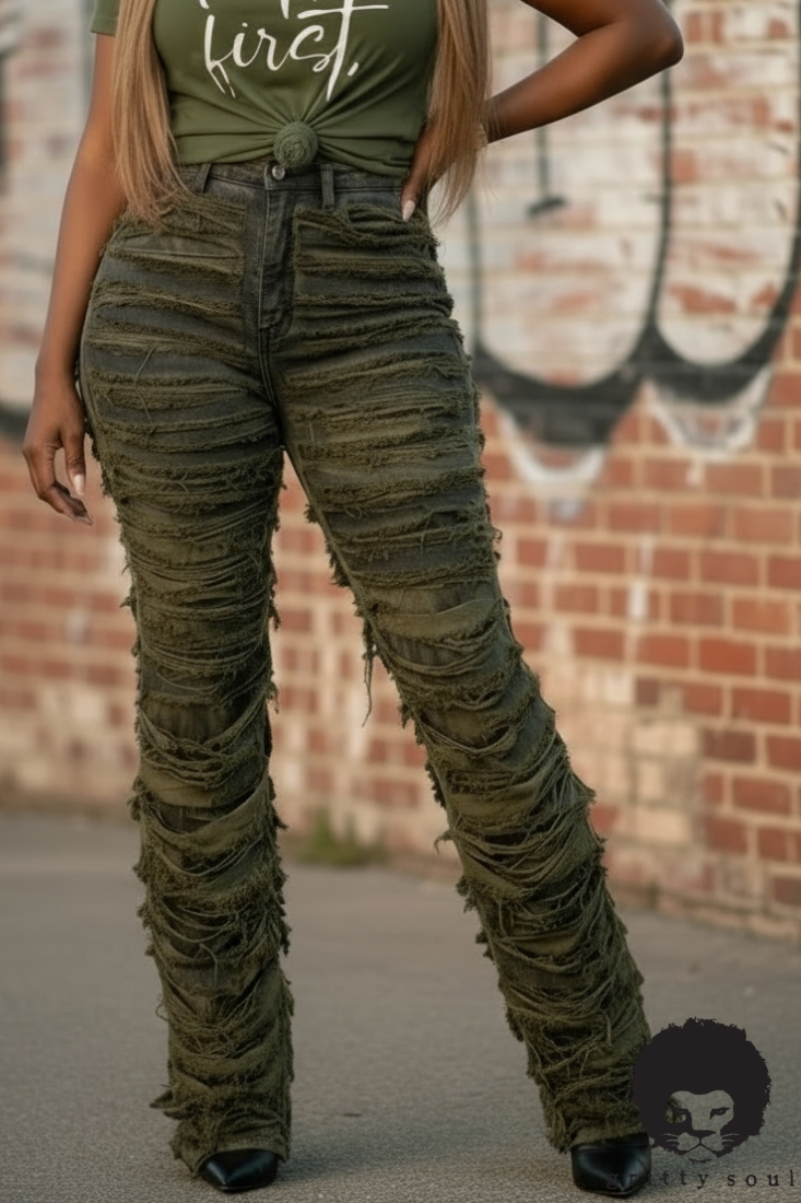 Step bold and unshaken in the Armor Up Luxe Jeans—where distressed streetwear meets grown-woman edge. Crafted in a deep olive hue with layered textured rips from waist to hem, these jeans command attention while keeping your fit versatile. Designed with a high-waist cut that sculpts your curves and elongates your legs, they’re the perfect balance of rugged and luxe. Pair them with your favorite statement tee or heels to complete the warrior-chic vibe.