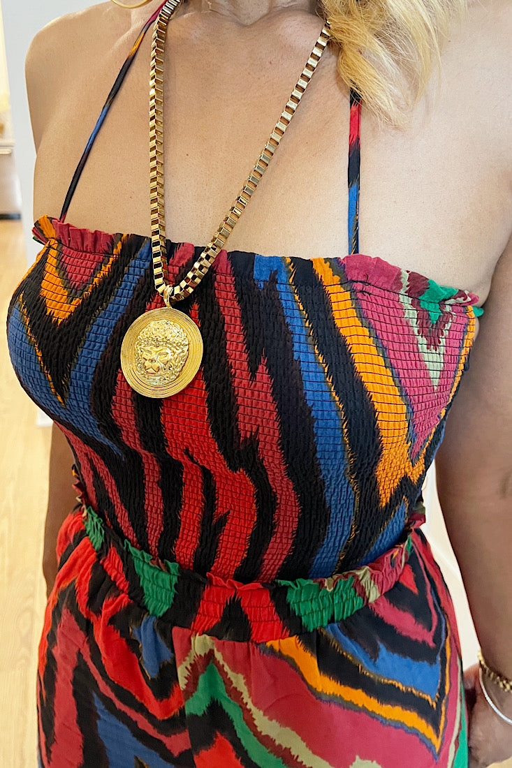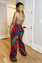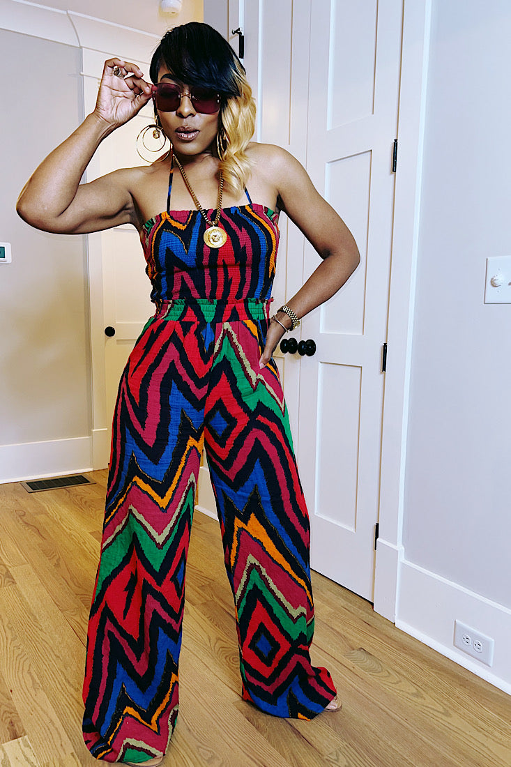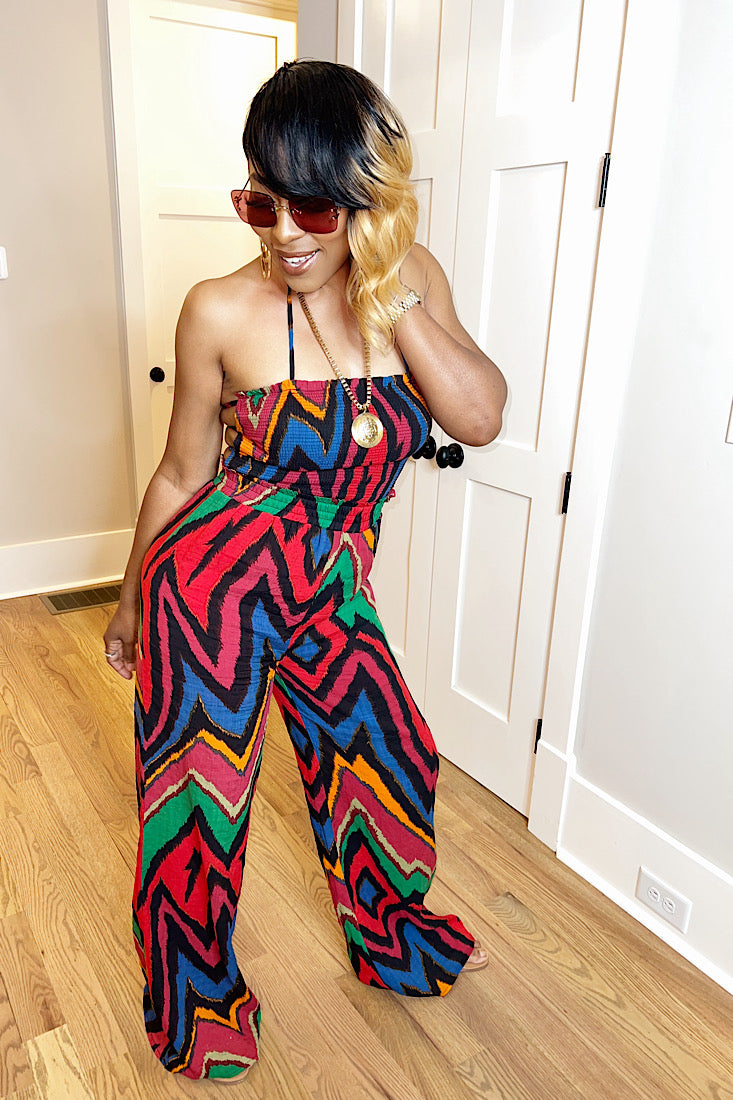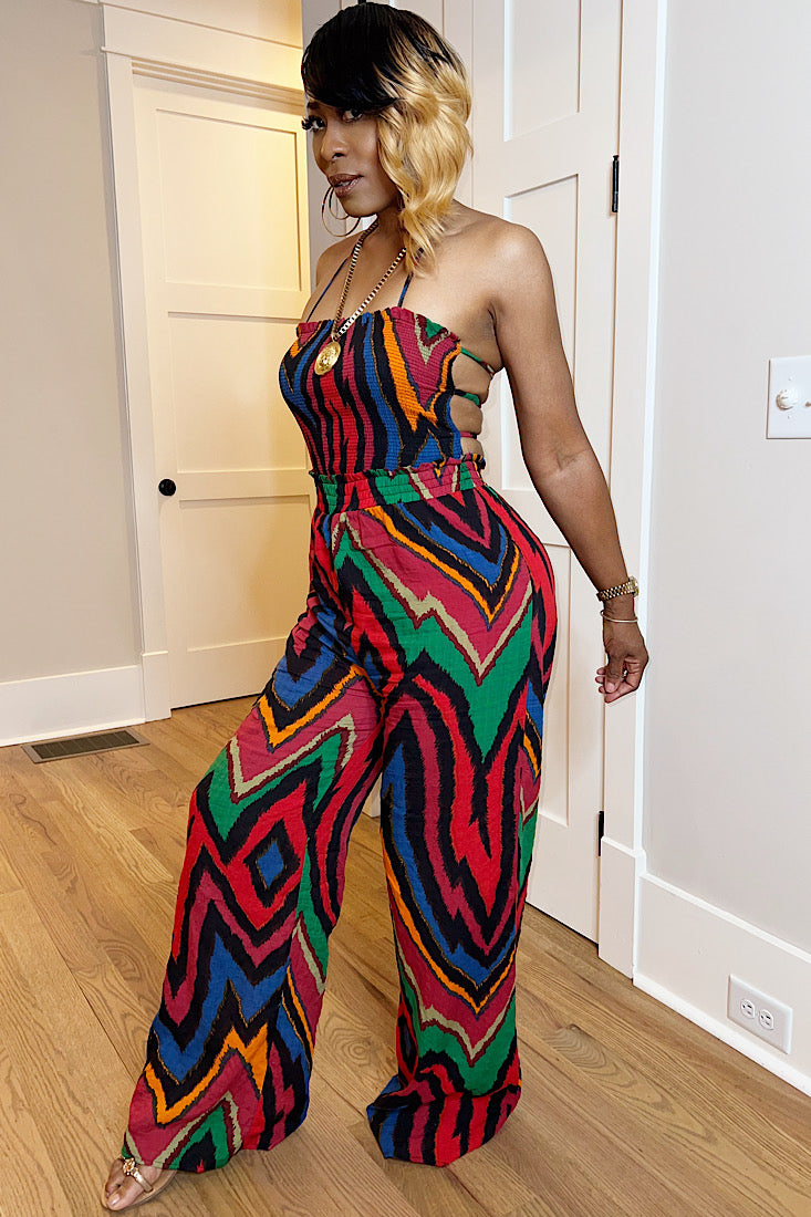 This jumpsuit does all the talking—front and back. Featuring a bold multicolor zig-zag print and sexy open-back strap detail, the Back Talk Jumpsuit brings effortless drama to your wardrobe. It hugs in all the right places with a smocked bodice and flows into wide-leg pants that command attention.
