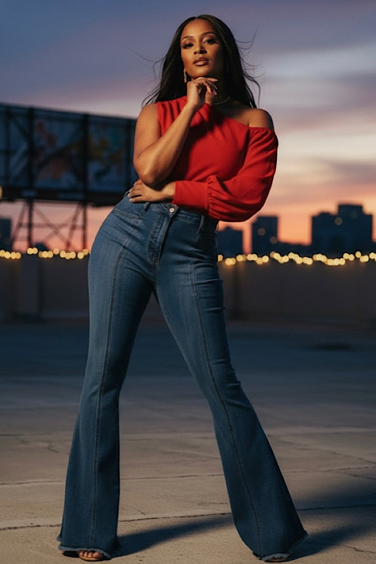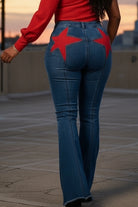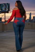 Step into the spotlight with the Backstage Star Flare Jeans — where bold style meets grown-woman edge. Designed with a curve-hugging fit that flows into a dramatic flare, these jeans are all about statement energy. The standout red star patches on the back pockets bring playful confidence, while the clean front and frayed hem keep it chic yet effortless. Made for the woman who shines whether she’s on stage or just owning her everyday vibe.