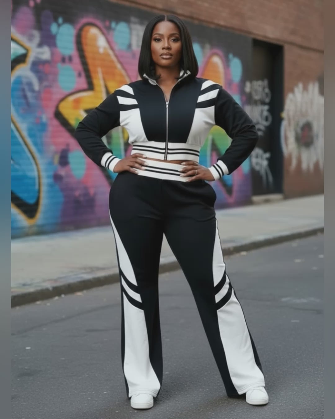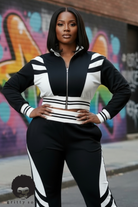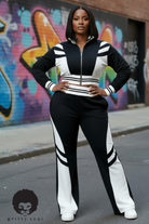The Black Power Play Tracksuit serves bold energy with clean lines and a commanding silhouette. Designed with contrasting black and white paneling, it features a zip-up mock neck top and wide-leg pants that create a sleek, elongated look. The fitted waistband accentuates your curves while the structured details deliver that luxury athleisure feel — polished enough for a statement outing, comfortable enough for everyday flex.