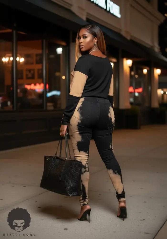 The Static Burn Jeans are your go-to for bold denim energy. These high-rise skinny jeans feature a dramatic black and tan bleach-wash finish that turns every step into a statement. Designed with stretch denim for a curve-hugging fit that stays comfy all day, they’re that perfect mix of edgy and sleek. Pair them with a neutral top or graphic tee and black heels for instant grown-soul attitude.