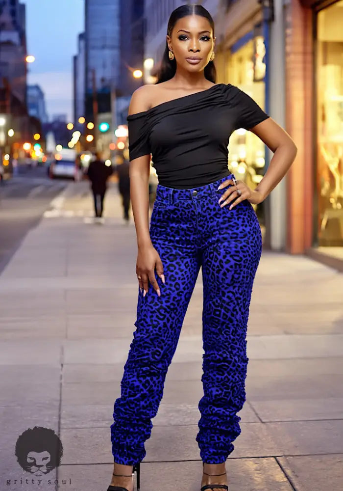 The Blue Leopard Stacked Jeans bring wild energy to your denim game. Designed in a bold cobalt-blue leopard print, these jeans combine fearless street style with a curve-loving stacked silhouette. The high-rise fit flatters your shape while the ruched, stacked legs give extra attitude with every step. Pair them with a sleek top and heels for a night out or keep it casual with sneakers—either way, they’ll have all eyes on you.