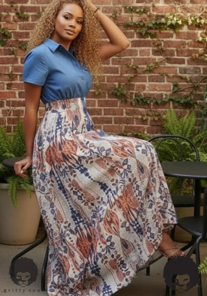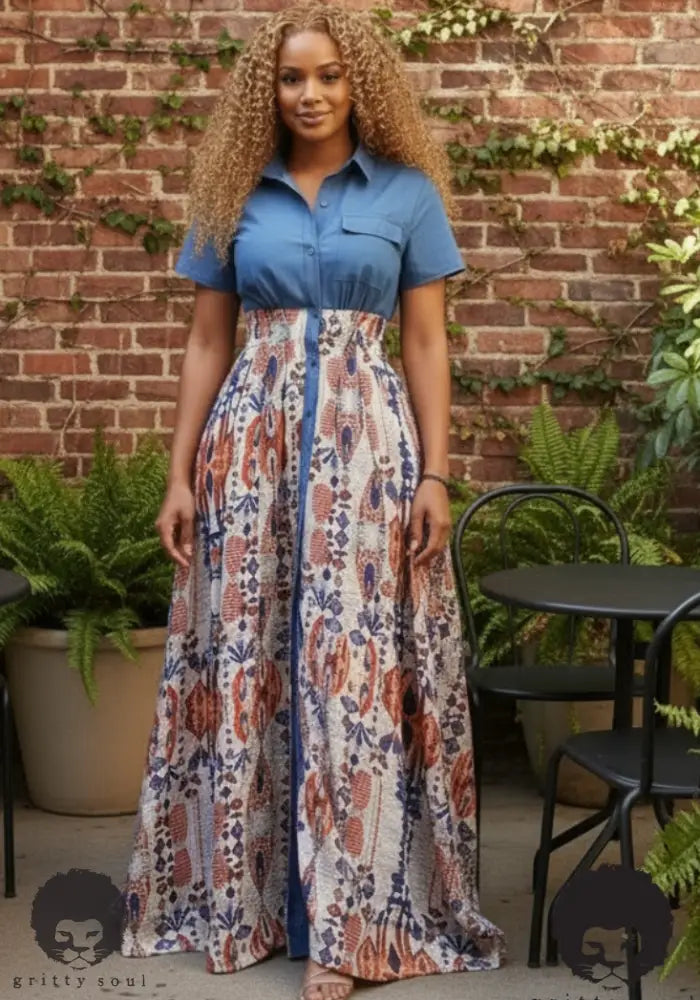 The Blue Mesa Maxi is where denim meets boho artistry. Featuring a button-up chambray top with a pocket detail and a flowy, printed maxi skirt, this dress gives effortless movement with a bold pop of pattern. Designed with a front slit for a little leg moment, itβs the perfect piece for brunch, vacation days, or those easy evenings when you still want to turn heads. Pair it with sandals or wedges for an instant statement look.