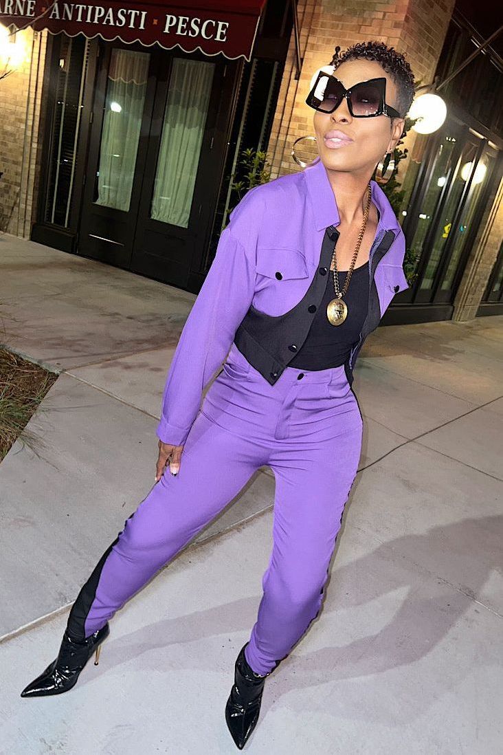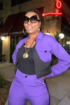 Step into your power and make a statement with the Bold Brooke Power Set! This two-piece wonder in a striking purple hue is designed for the Gritty Girl who’s unafraid to own her boldness. With tailored lines and edgy black panel accents, this set adds that perfect touch of sass while keeping you on-trend and unstoppable. Whether you’re turning heads on a night out or making moves by day, this set was made to amplify your confidence.