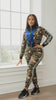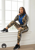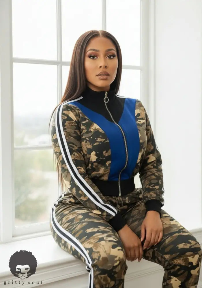 The Bootcamp Status Tracksuit is for the Gritty Girl who stays ready — bold, confident, and never afraid to stand out. This camo-and-cobalt combo brings that fearless bootcamp energy with a voguish spin, giving you a look that’s tough but still fashion-forward. The cropped zip jacket cinches the waist while the tapered joggers keep your silhouette sharp, whether you're running errands or shutting down brunch.