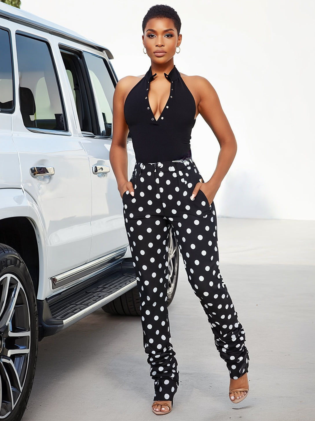 Own every entrance. This high-neck halter-style bodysuit features a snap-front placket that lets you dial the drama from buttoned-up chic to deep-V daring in seconds. Ultra-smooth, double-brushed stretch knit sculpts your curves without squeezing, while the thong-back finish keeps pant lines invisible. Whether you’re pairing it with power trousers or stacking it under a statement jacket, this one-piece says “I’m running the room” before you even speak.