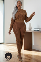 Sweet, soft, and shaped to flatter—Brown Sugar Sweater Set serves cozy curves with a luxe cable-knit texture from top to hem. The cropped sweater cinches the waist with rib trim while the high-rise jogger pant smooths and snugs in all the right places. Stretchy, medium-weight knit keeps you warm without the bulk, perfect for coffee runs, flights, and cute nights in. Style it with clear heels or sneakers—either way, it’s giving grown-woman lounge glamour.