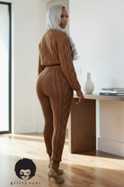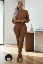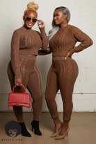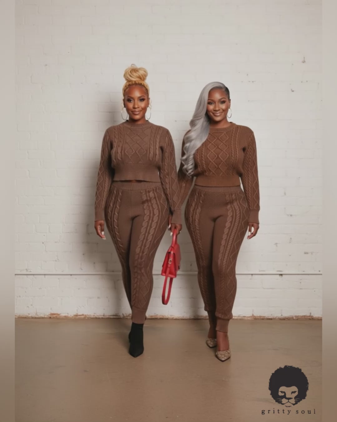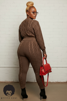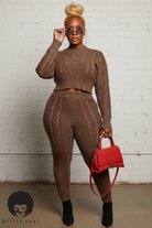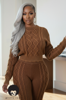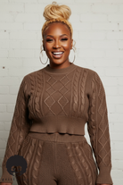 Sweet, soft, and shaped to flatter—Brown Sugar Sweater Set serves cozy curves with a luxe cable-knit texture from top to hem. The cropped sweater cinches the waist with rib trim while the high-rise jogger pant smooths and snugs in all the right places. Stretchy, medium-weight knit keeps you warm without the bulk, perfect for coffee runs, flights, and cute nights in. Style it with clear heels or sneakers—either way, it’s giving grown-woman lounge glamour.