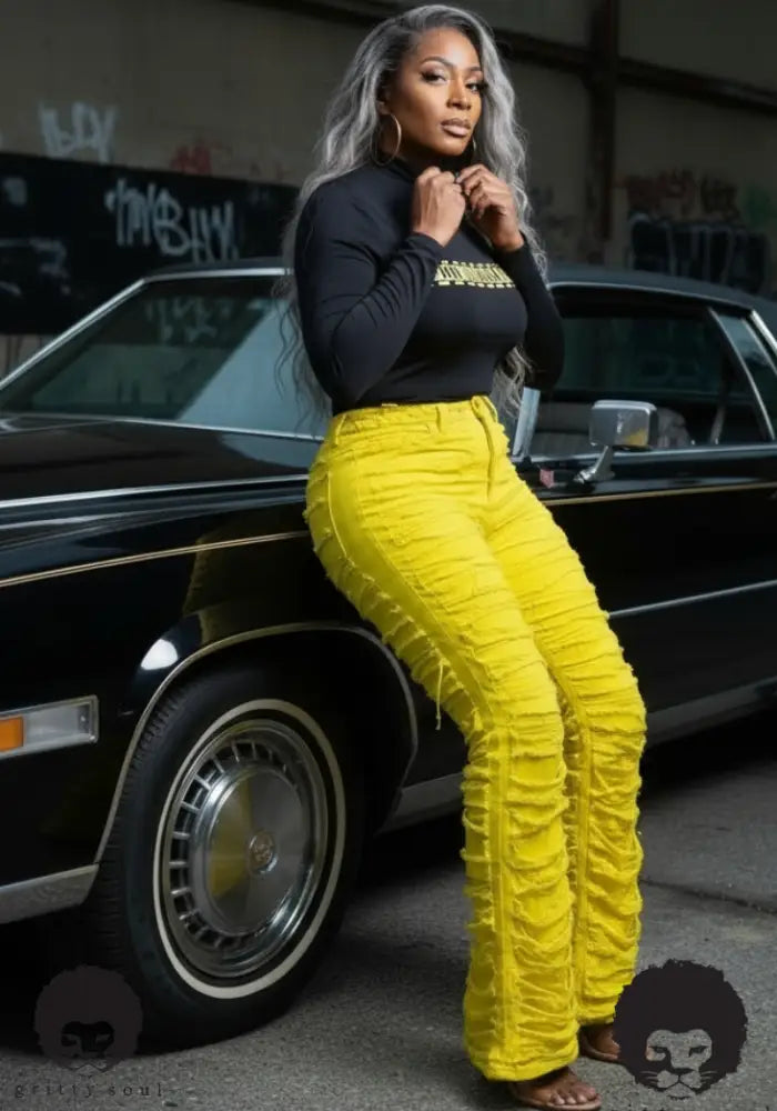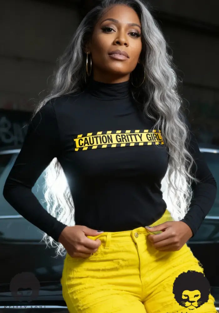 Be fly, fierce and fabulous in this "Caution Gritty Girl High Collar Stretch Top!" This black long sleeve mock neck shirt gives the perfect combo of sexy, comfort, and class all at the same time. Gritty Soul's exclusive "Caution" logo embellishes the front of the top. When you pair this beauty with other 'Caution Gritty Girl' pieces, get ready to make the onlookers 'all pause when you walk into the room'...word to Klymaxx!