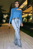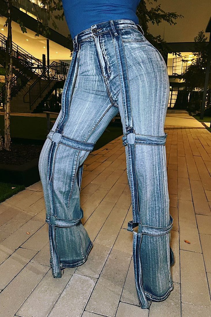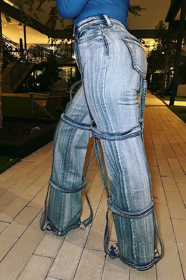 These unique wide-leg jeans offer an innovative take on classic denim, featuring striking strap details for a modern edge. Perfect for making a statement, they combine comfort with flair.
