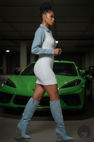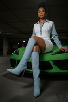 Say hello to the Diamond Heart Denim Boots—light-wash denim knee-highs lit with crystal heart bursts and scattered gem studs. A sleek pointed toe and stiletto heel bring the legs-for-days illusion, while a hidden inner zipper keeps the fit easy and secure. They’re the statement finisher for sweater dresses, minis, and your favorite jeans.