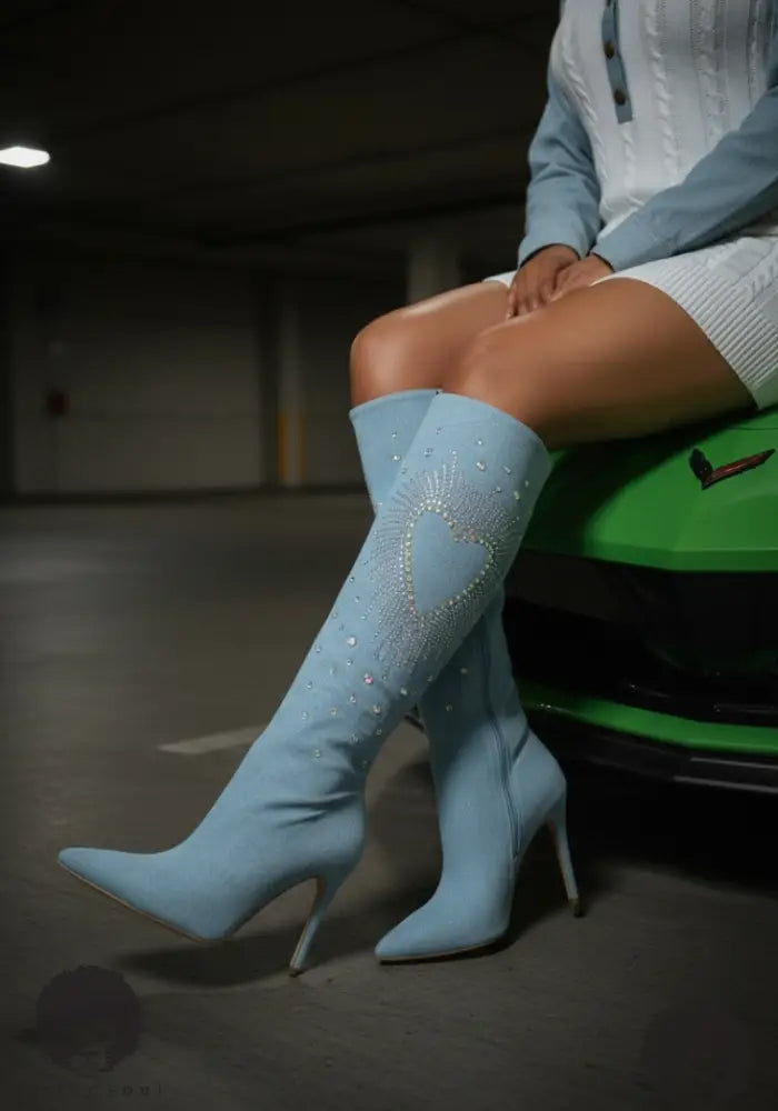 Say hello to the Diamond Heart Denim Boots—light-wash denim knee-highs lit with crystal heart bursts and scattered gem studs. A sleek pointed toe and stiletto heel bring the legs-for-days illusion, while a hidden inner zipper keeps the fit easy and secure. They’re the statement finisher for sweater dresses, minis, and your favorite jeans.