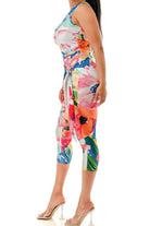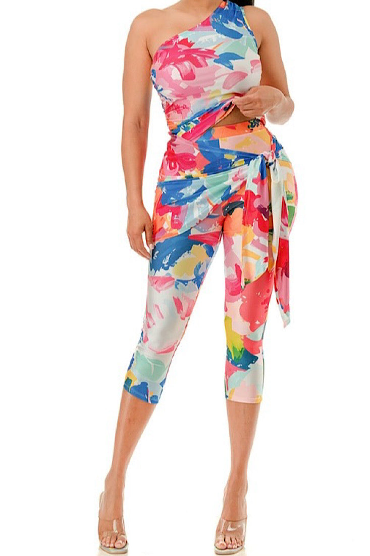Turn heads in this bold, art-inspired two-piece that effortlessly blends comfort with high-impact style. The asymmetric one-shoulder crop top showcases your shoulders, while the matching capri-length leggings feature a drapey tie-waist sash for an adjustable, flattering fit. Crafted from a stretchy, moisture-wicking jersey, this set moves with you—whether you’re hitting brunch with the girls or stepping out for a sunset stroll. With its painterly florals splashed across a kaleidoscope of hues, it’s your go-to look for summer vibes and beyond.