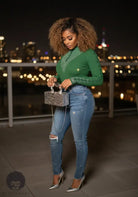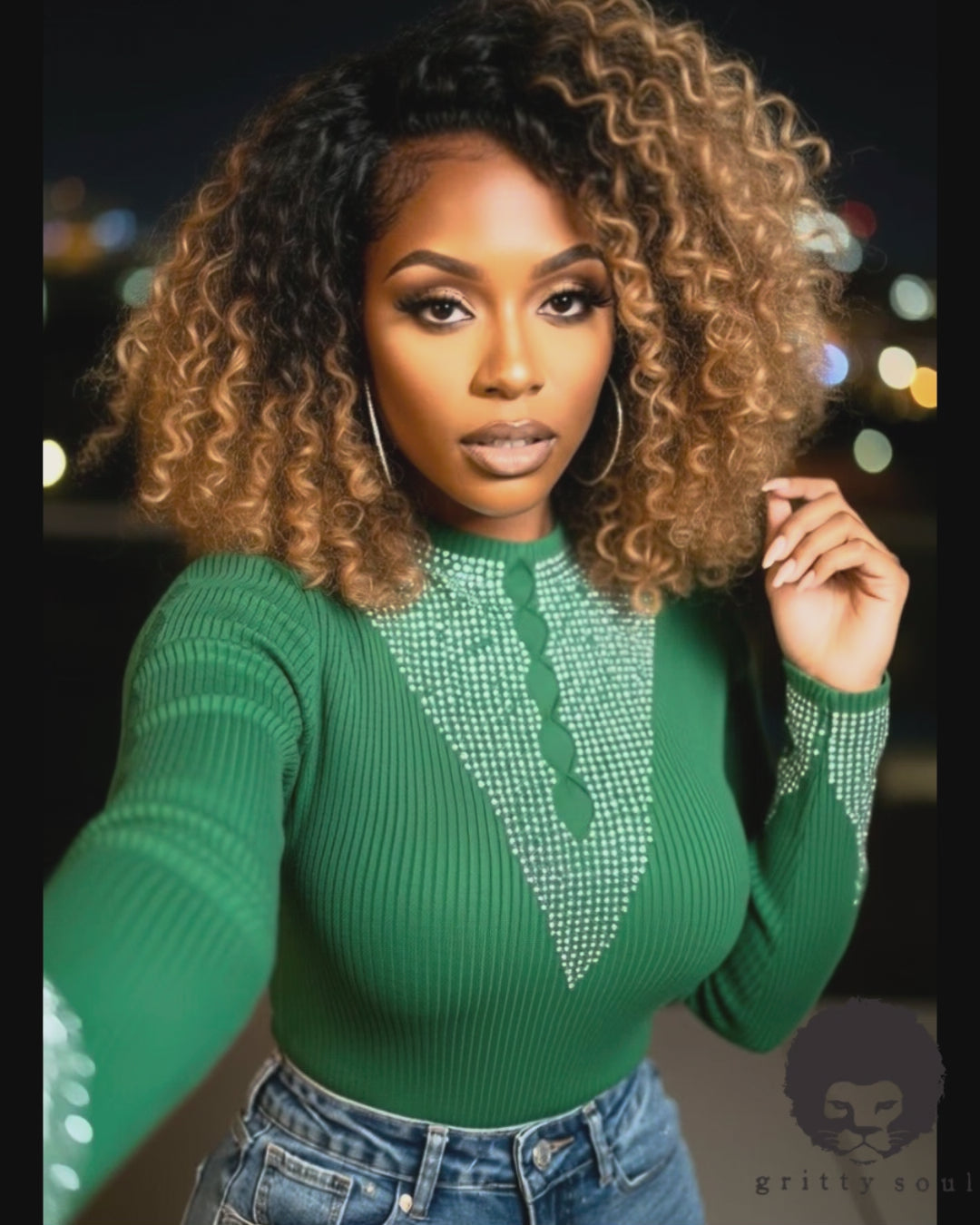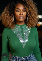 Queen, this top is giving shimmer, texture, and grown-woman glam all in one. The ribbed, sheer mesh base hugs your body while the rhinestone detailing brings that sparkling energy you can dress up or down. The mock neckline and fitted silhouette make it a sleek, fashion-forward staple. Perfect for layering under jackets or standing alone when you’re ready to shine.