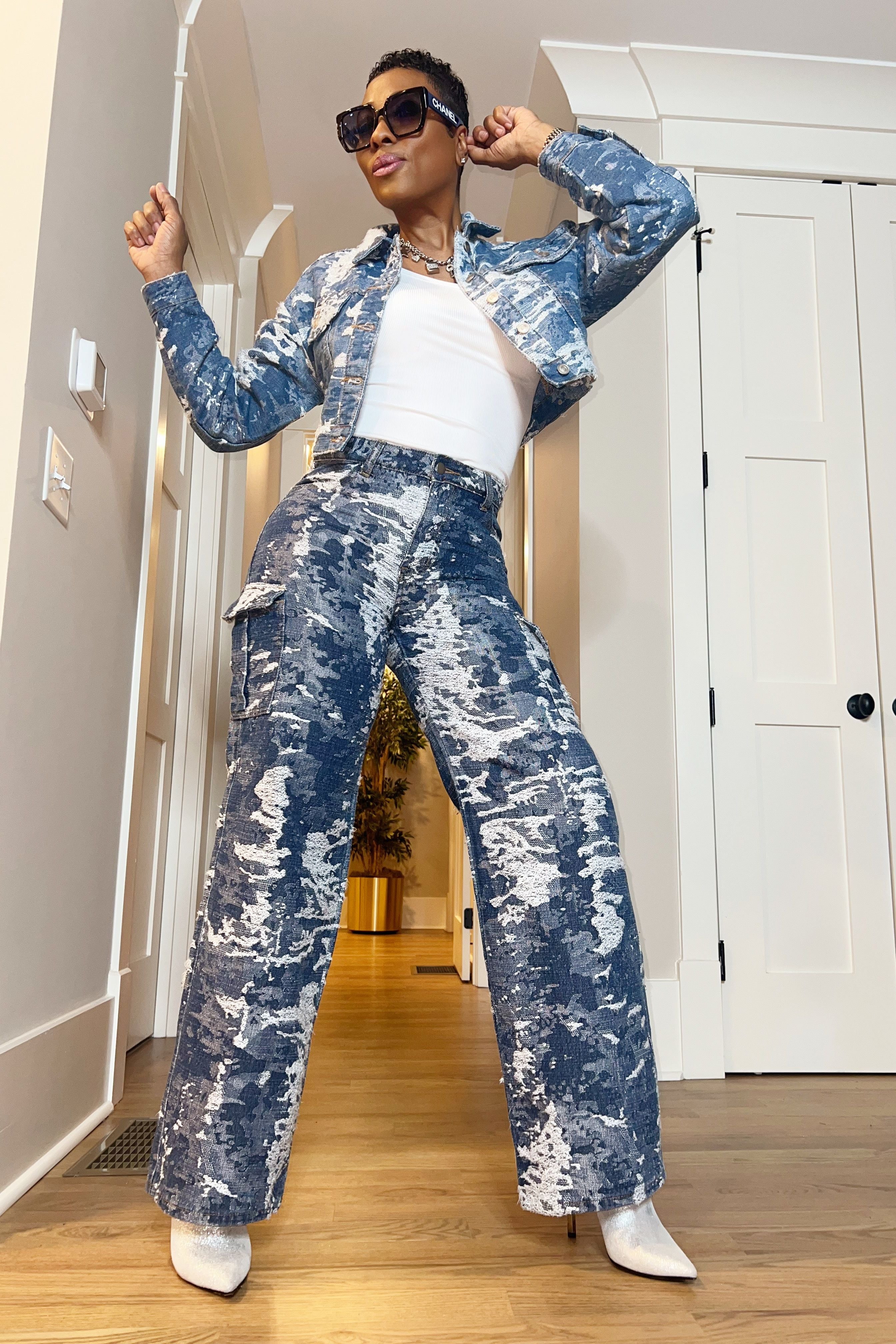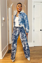 This stylish denim set combines a trendy distressed jacket with a chic matching jeans. A perfect blend of street edge and bold style. Designed with intricate jacquard trims, this jacket adds a luxe touch to classic denim.