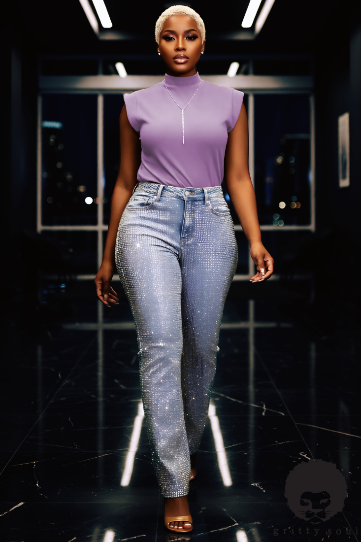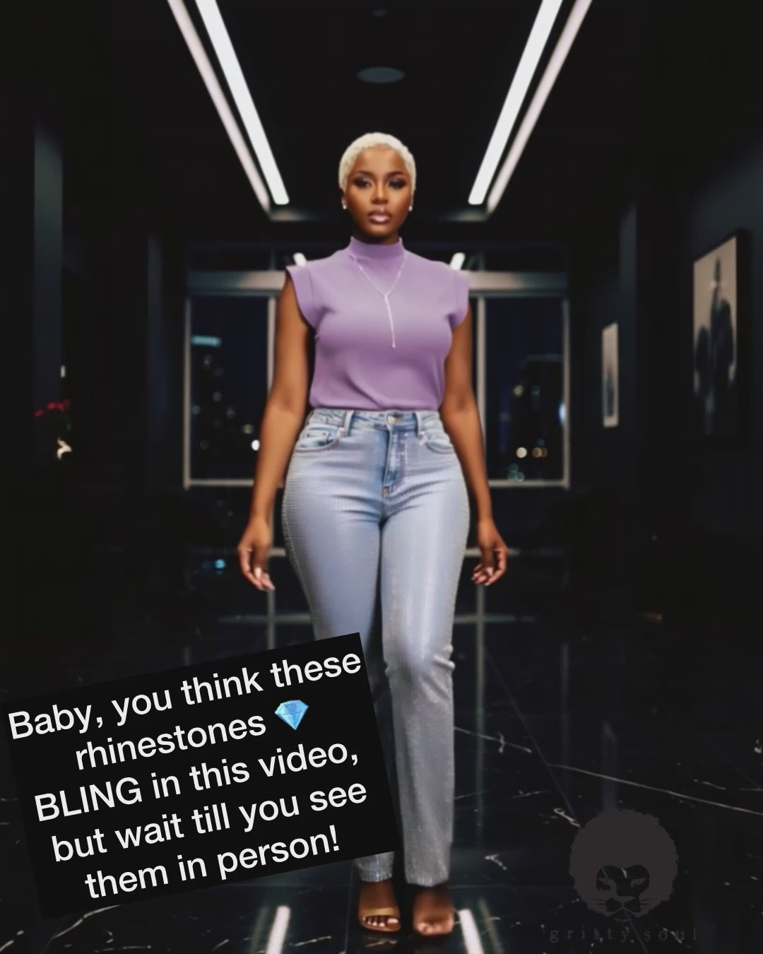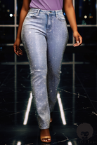 Frostbite Flex Jeans bring icy glam with a sleek fit that hugs and flexes in all the right places. Designed in a light wash and drenched in rhinestones, these jeans catch the light with every step. The straight-leg silhouette makes them versatile enough for heels or sneakers, while the stretch gives you comfort without losing that luxe edge. Bold, grown-woman denim that’s made to shine.