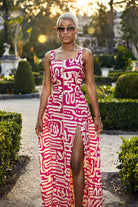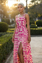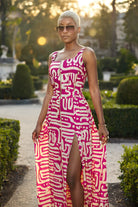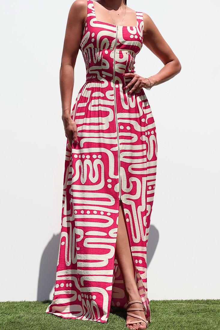 Step into instant main-character mode in the Fuchsia Flow Dress—a bold maxi that swirls ivory glyphs over electric-fuchsia fabric like wearable street art. The square neckline and wide straps frame the shoulders, while the zip-front closure lets you control the drama (hello, thigh-high slit or demure day look—your call).