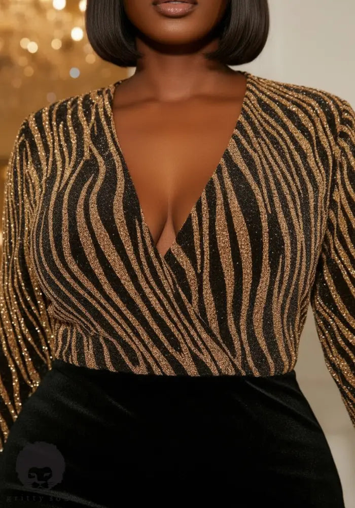 Sis… this dress is pure “grown-woman glam.” The Gilded Glam Hourglass Dress wraps you in a glimmering bronze surplice top with soft metallic striping that catches every bit of light. The velvet midi skirt hugs your curves with that smooth, sculpted finish that makes your silhouette look snatched without even trying. Slight stretch keeps it comfortable, while the deep wrap neckline brings that subtle, sultry energy your wardrobe has been asking for.