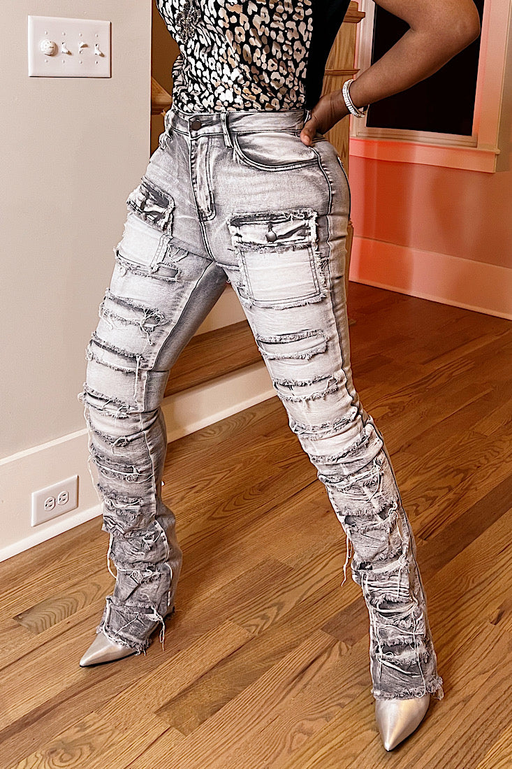 Balance bold and effortless in the Gray Harmony Stacked Jeans — where grunge meets grace. With exaggerated distressing, statement cargo pockets, and a stacked leg that elongates your silhouette, these jeans hit every high note.