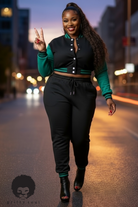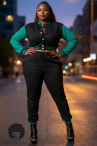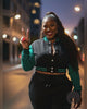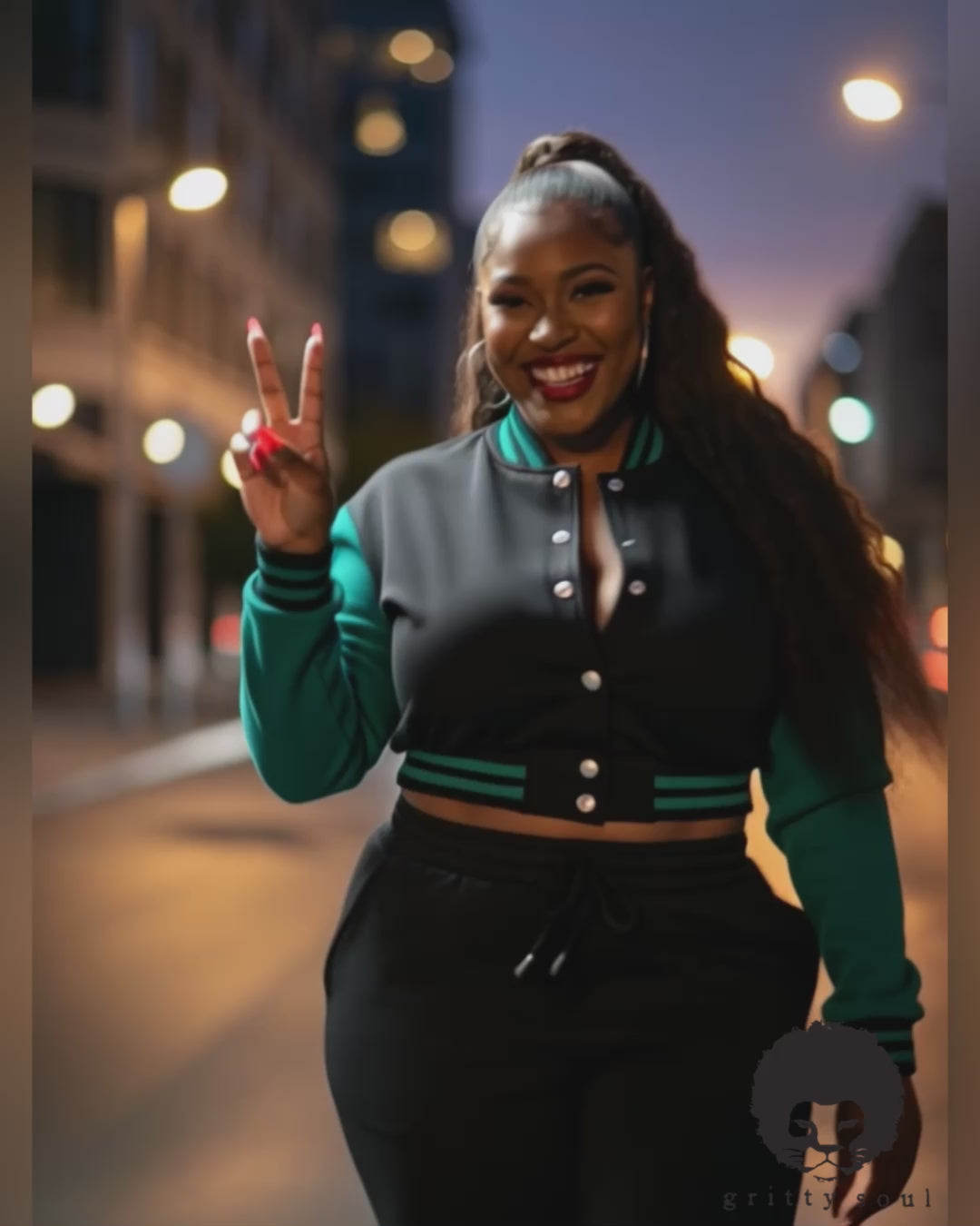 The Gritty League Set delivers bold varsity energy with a luxe edge. Designed in a sleek black and green palette, this two-piece features a cropped snap-button bomber jacket with striped trim and perfectly matching joggers that hug your shape with comfort and attitude. Whether you’re running errands or serving street-style goals, this set says power, poise, and pure Gritty Soul.