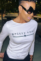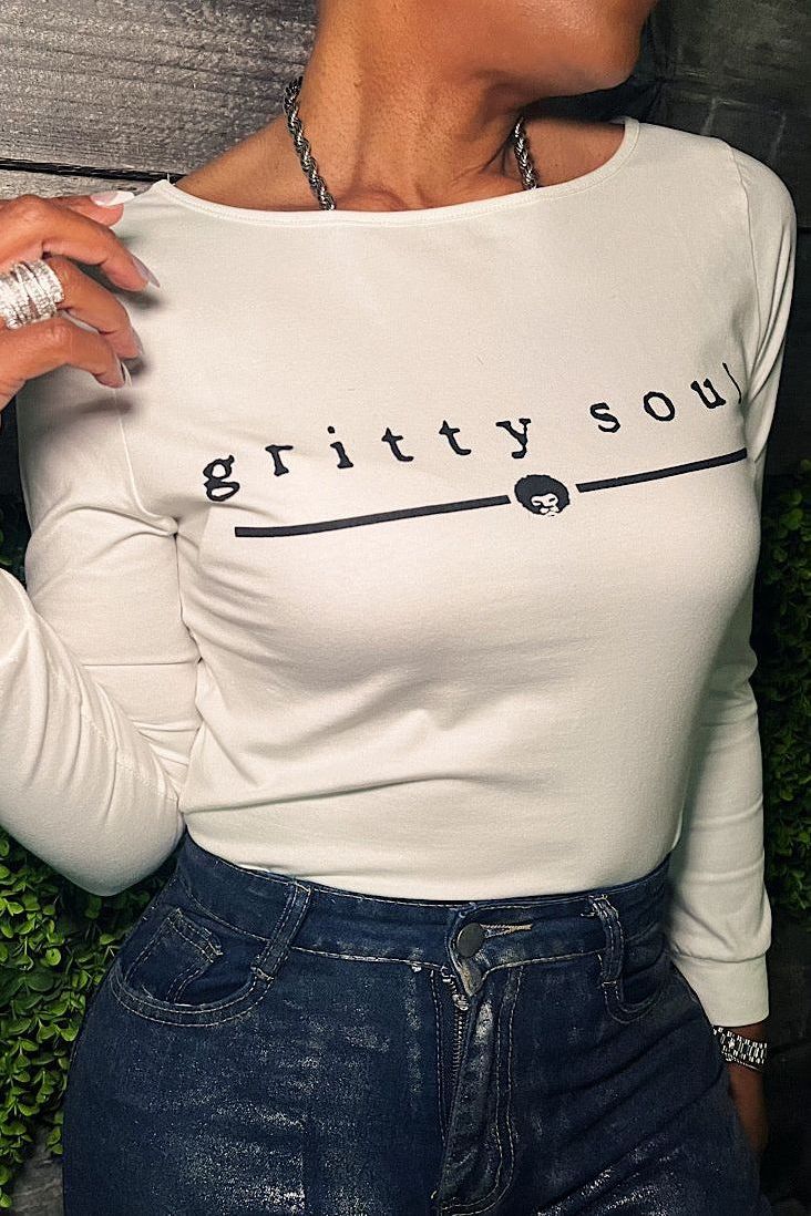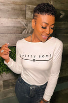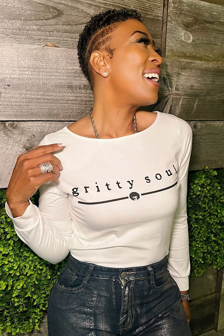 The Gritty Lumberjack Tee is a limited edition. This fitted long sleeve tee is soft and is accented with a rounded collar, just about the gritty soul graphic print!