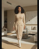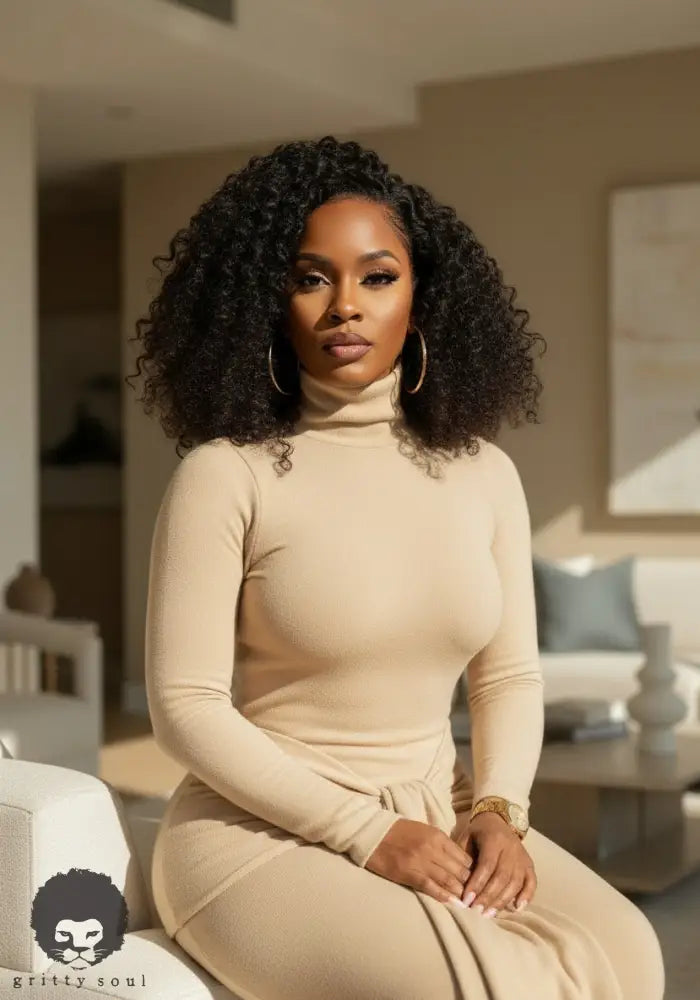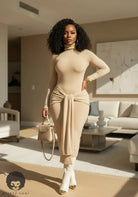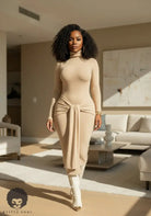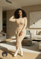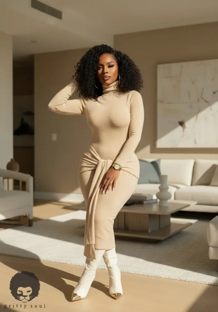 The Honeycomb Hourglass Dress is that soft, sculpting nude knit that hugs every curve while still keeping it classy. The turtleneck and long sleeves balance out the body-skimming fit, making it perfect for dinner dates, events, or pulled up with boots in cooler weather. The front tie detail cinches the waist and drapes down the front, giving you a built-in snatched effect with zero effort. Style it with gold statement earrings and neutral heels for effortless grown-woman glam.
