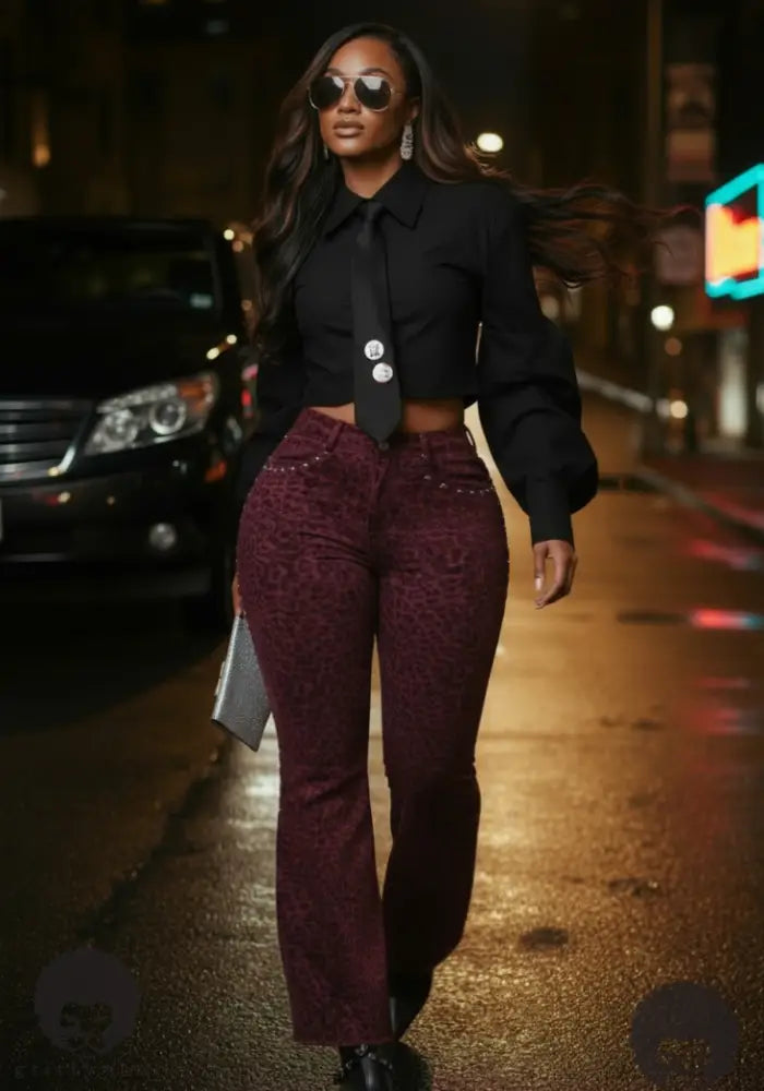 Bring the heat in the Red Riot Flare Denim — a bold mix of wild print and luxe detail that turns heads from every angle. Crafted with a deep red leopard pattern and pearl-studded accents, these bell-bottom jeans are a power move in denim form. The medium-stretch fit hugs your curves while keeping comfort locked in, finished with a high-rise waist and full-length flare that delivers major leg energy.