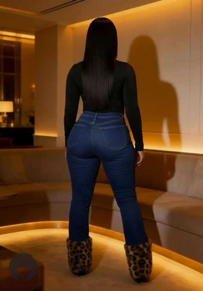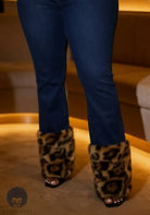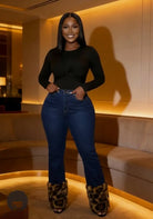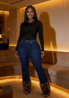 The Wild Card Statement Jeans are where clean denim meets bold personality. Crafted in a rich dark-wash blue, these high-rise jeans hug the waist and hips before falling into a straight-to-slight flare leg for a flattering, grown-woman fit. The real statement lives at the hem, finished with plush leopard-print faux-fur cuffs that instantly elevate the look.