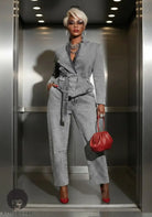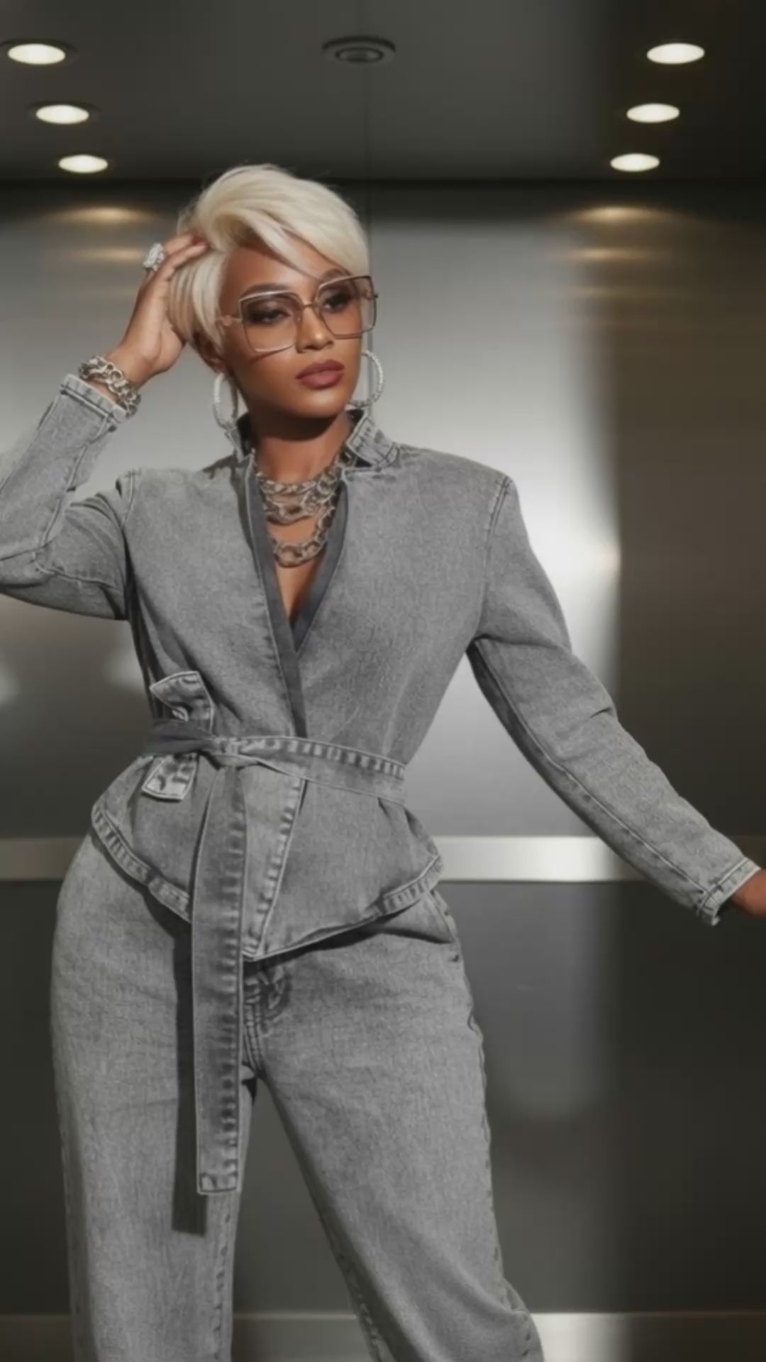 This washed-grey denim two-piece brings that confident, unbothered “grown and glowing” vibe every Gritty Girl owns. The jacket has a soft stand collar, open-front cut, and a matching self-tie belt that shapes the waist without losing that relaxed street-style edge. The matching wide-leg pants feature a vintage ash wash, subtle seaming at the knee, and a straight silhouette with an easy drape that feels effortlessly fashionable. Wear it together for a monochrome moment or break it up with your favorite basics — either way, it’s serving Fifty Shades of Slay.