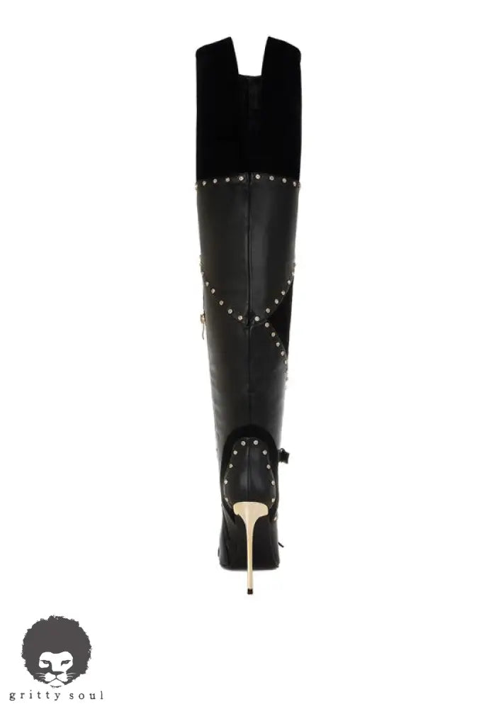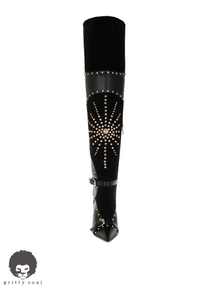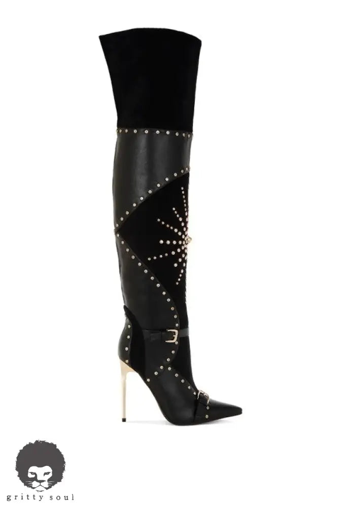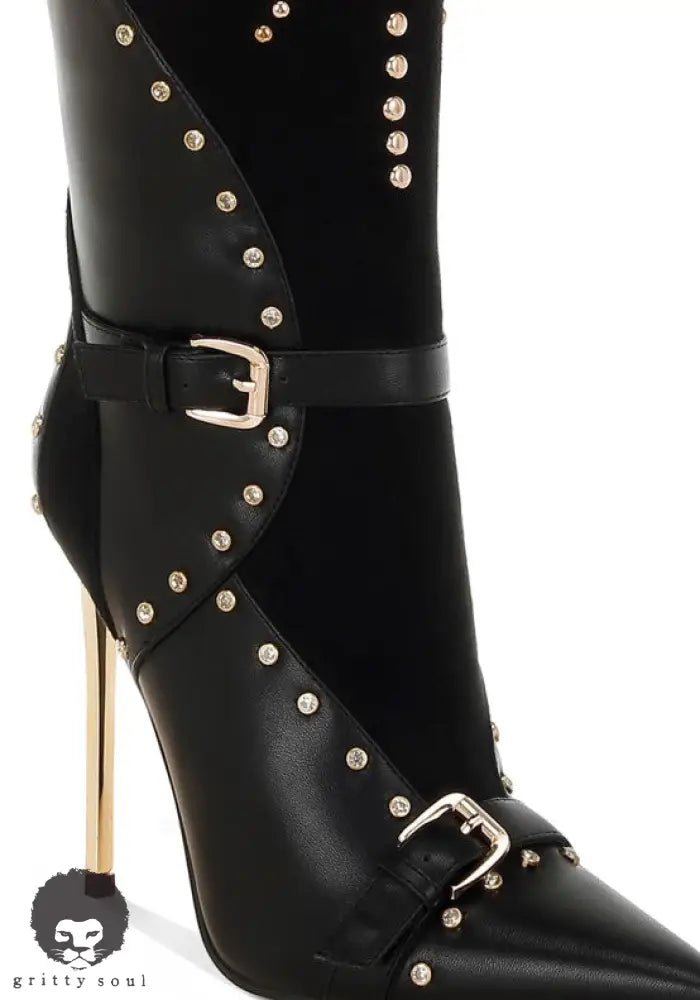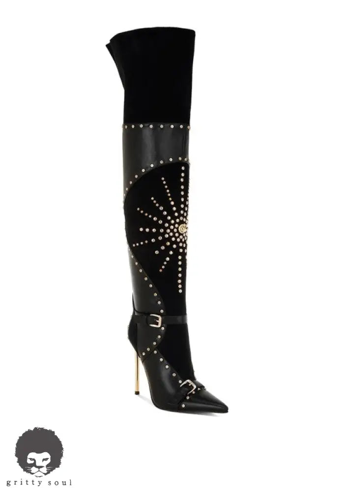These pointed toe stiletto heel boots are a major statement-maker. The chic stud and diamante embellished motifs add an edgy appeal. Style these with a bodycon dress or a denim skirt and spaghetti top for a sundowner.