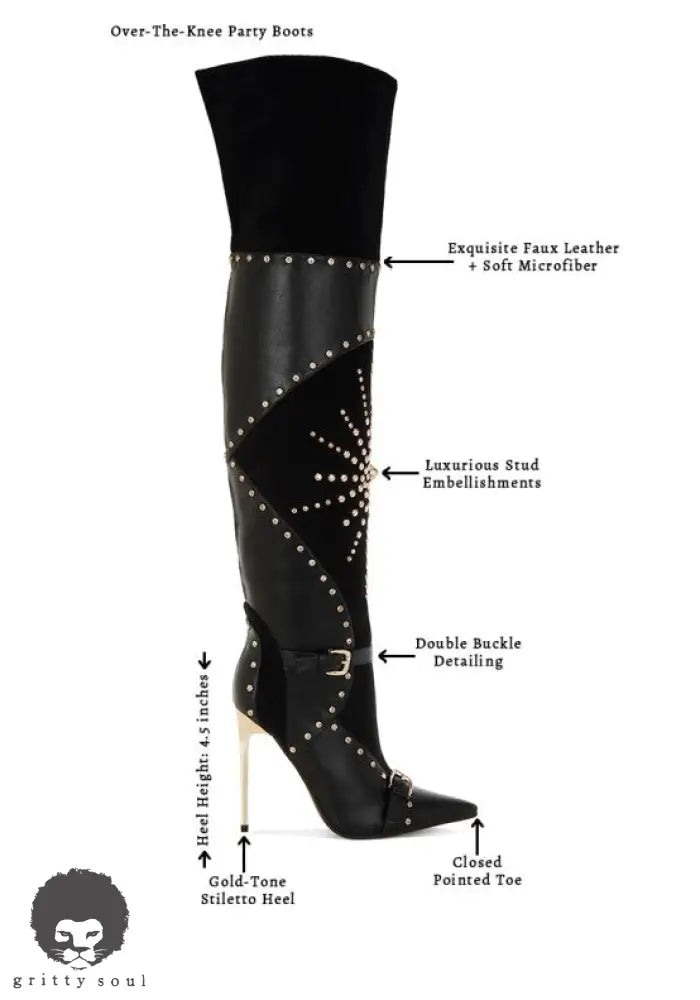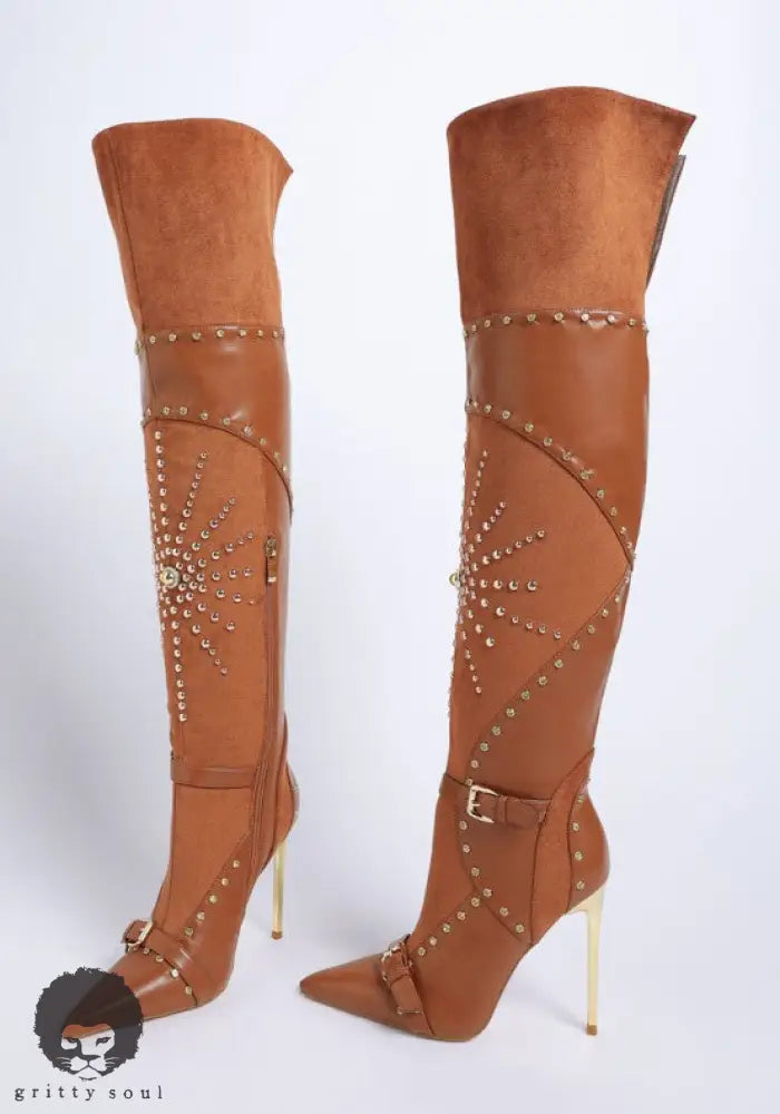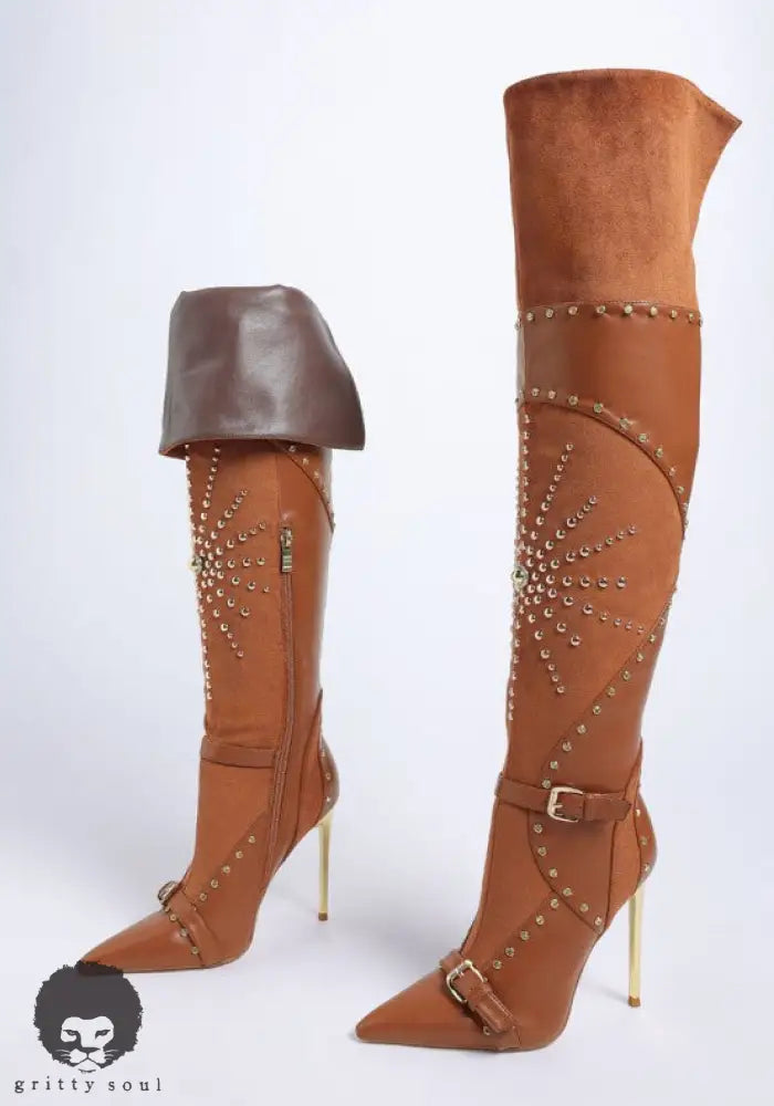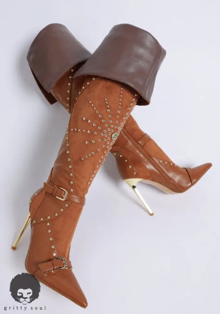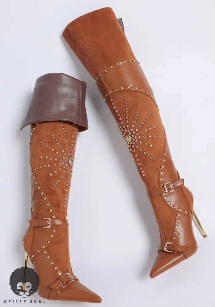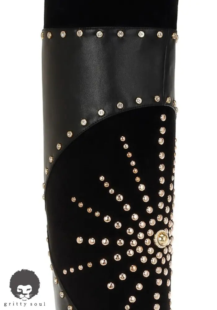These pointed toe stiletto heel boots are a major statement-maker. The chic stud and diamante embellished motifs add an edgy appeal. Style these with a bodycon dress or a denim skirt and spaghetti top for a sundowner.