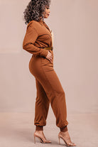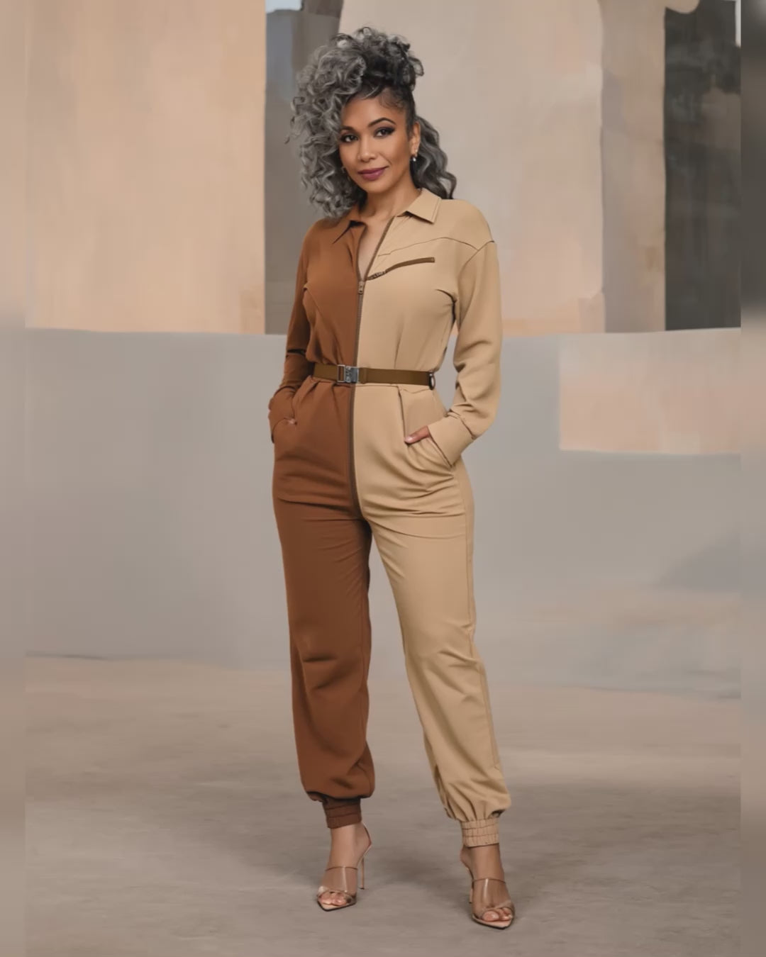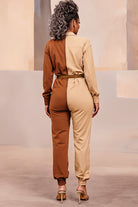 The Mocha Split Jumpsuit serves up style with a side of bold contrast. Featuring a two-tone mocha and beige palette, this one-piece blends utility chic with street-style edge. The zip-front detail, belted waist, and jogger-style cuffs make it as flattering as it is functional—perfect for turning heads from coffee runs to cocktails.