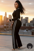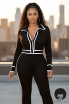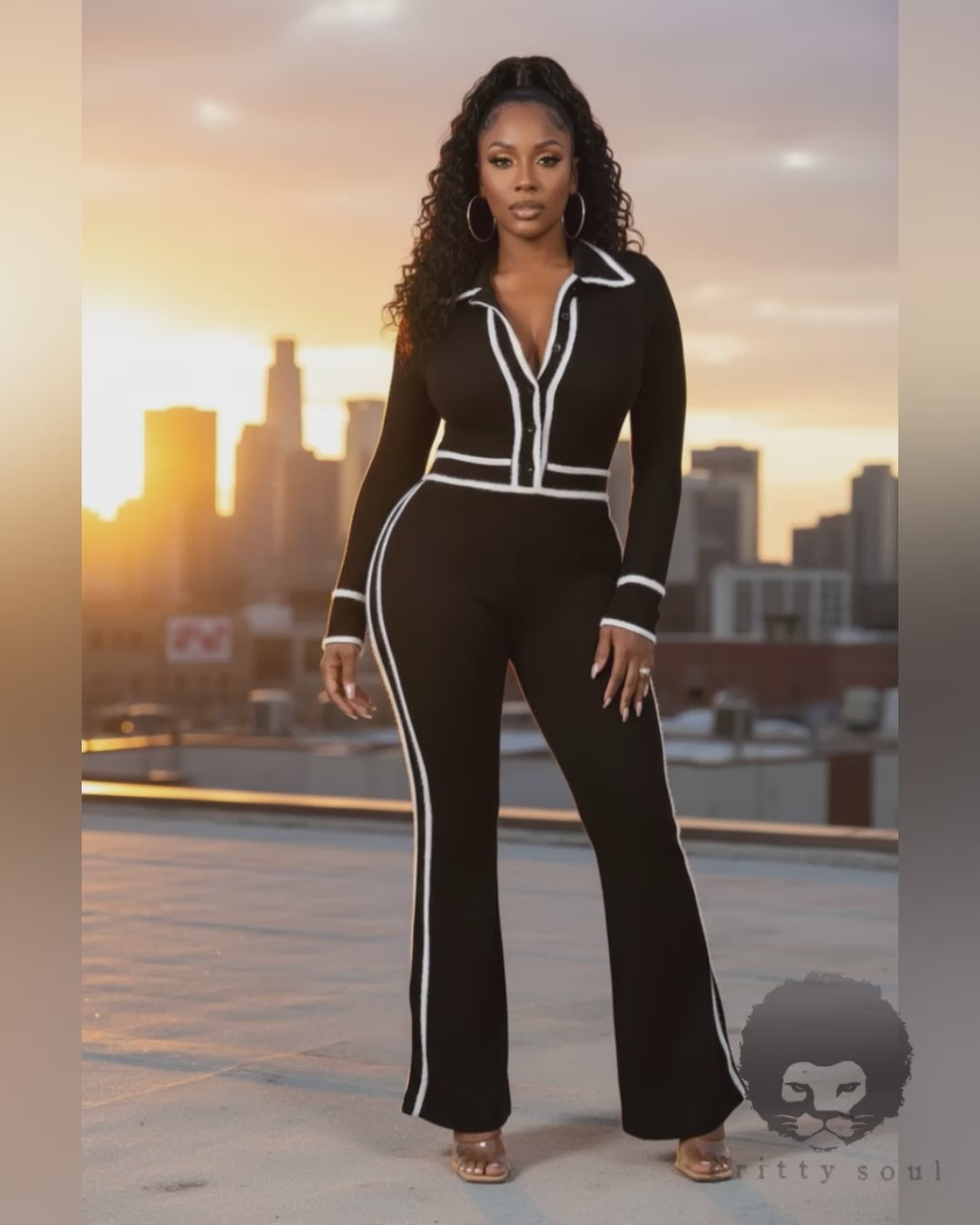 Bold, sleek, and unapologetically chic—our Outline Me Jumpsuit is your go-to power piece for day-to-night glam. Crafted in a ribbed knit with just the right amount of stretch, this fitted one-piece hugs your curves while the fur-lined contrast trim defines every edge. Finished with a collared neckline and button-up front, it brings boss vibes with a touch of cozy luxe. The flared leg silhouette elongates your frame, making this a must-have statement jumpsuit for the season.