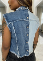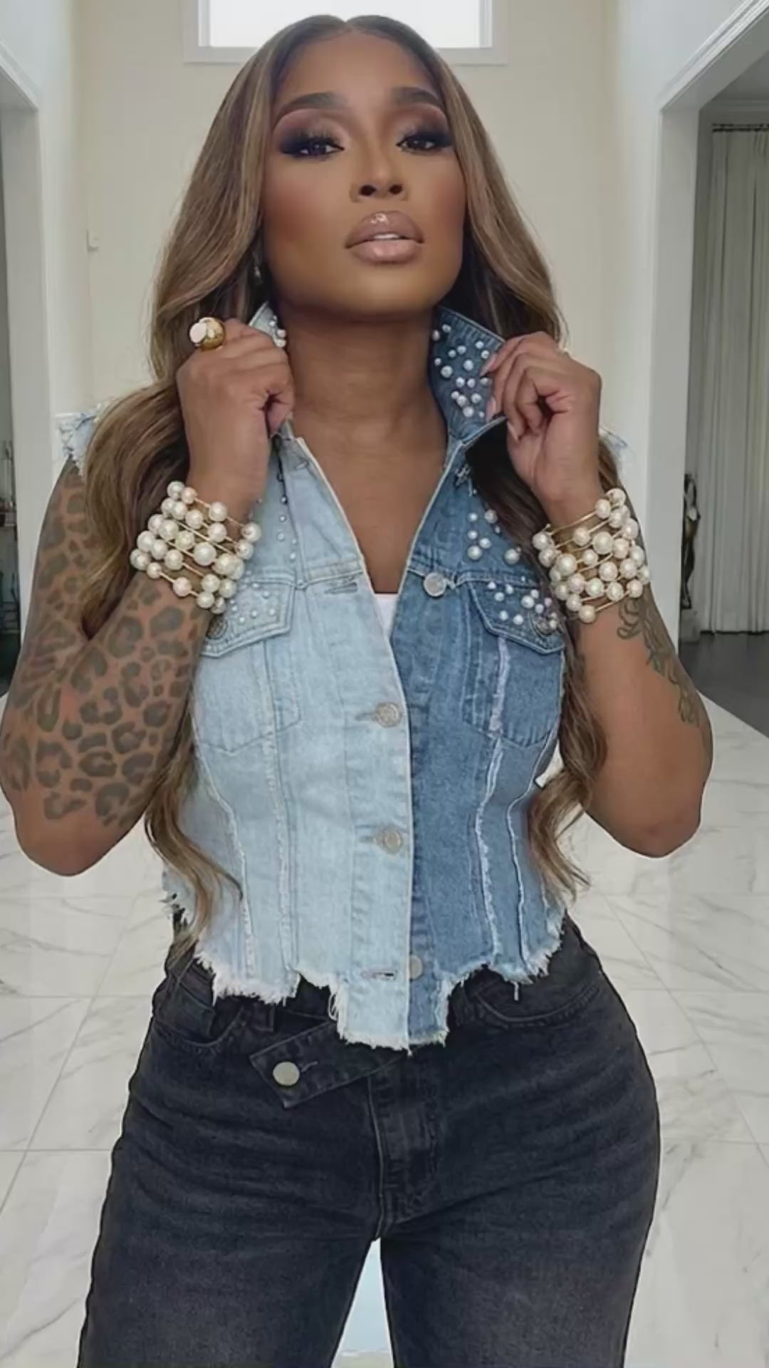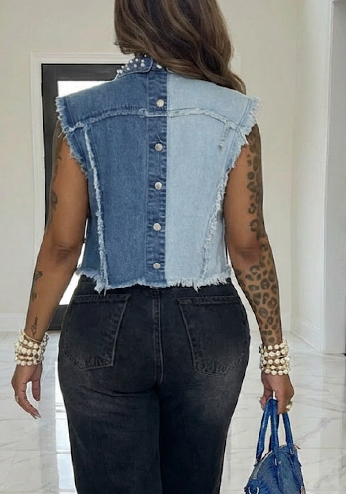 Split Decision Pearl Vest is that statement denim layer that turns a simple outfit into a whole look. The bold two-tone wash gives contrast and attitude, while the pearl embellishments bring a luxe touch that reads expensive in real life. It’s sleeveless with raw-edge details for an edgy finish, and it buttons up just enough to show shape while still letting your curves breathe. Throw it on with jeans, leggings, or a skirt and let it do what it do.