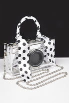 Steal the show with the Picture Perfect Handbag—a glossy, camera-shaped statement piece that turns every outing into a photo op. Its mirrored hard-case body is trimmed with a playful polka-dot scarf-wrapped handle and finished with a sleek chain strap for easy crossbody wear. Compact yet functional, it fits the essentials without sacrificing the drama. Perfect for nights out, events, and “did-she-really?” moments.