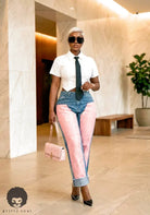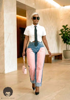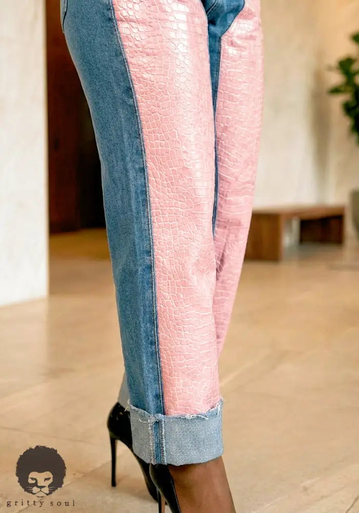 Pink Croc Luxe Jeans are that “main character” denim—premium blue jeans reworked with bold pink faux-croc vinyl panels down the front for a high-impact, fashion-forward finish. The low-rise cut gives Y2K attitude, while the relaxed straight leg and wide cuffed hems bring a modern western edge that looks expensive from every angle. Slight stretch keeps them comfy, but the structure keeps them sharp—these are the jeans you build a whole look around.