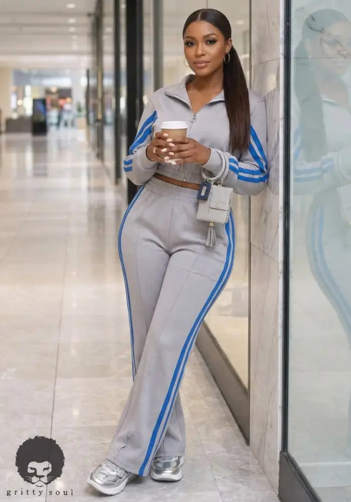 Platinum Pace Tracksuit is where elevated athleisure meets main-character energy. Crafted from a smooth modal scuba blend, this set delivers structure without stiffness and stretch without sag. The cropped zip-front jacket features a sleek mock neckline and sporty mesh tape detailing, while the matching flare pants balance comfort and contour with a flattering, lengthening fit. This is the kind of set you throw on when you want to look put-together without trying too hard.