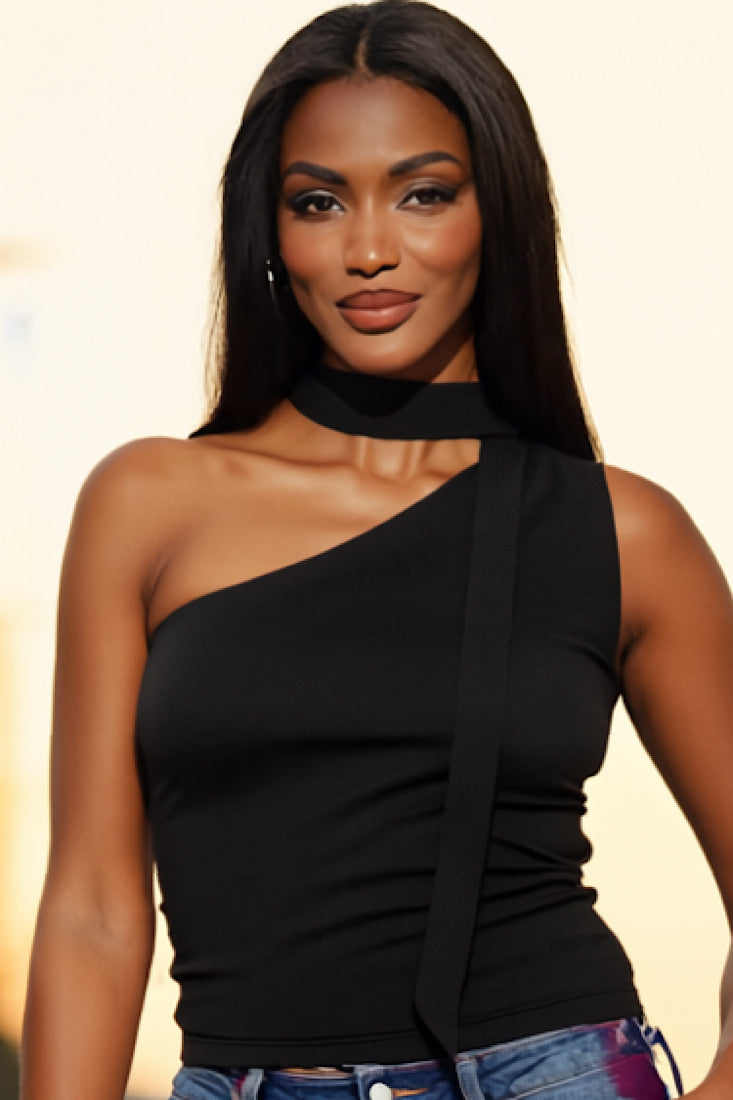 Turn every glance into a double take with the Side Note Statement Top. This one-shoulder stunner blends sleek minimalism with an edgy twist, thanks to its built-in choker detail and asymmetrical neckline. Perfect for pairing with high-waisted denim or a bold skirt, it’s the ultimate top for nights when you want to say a lot—without saying a word.