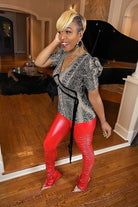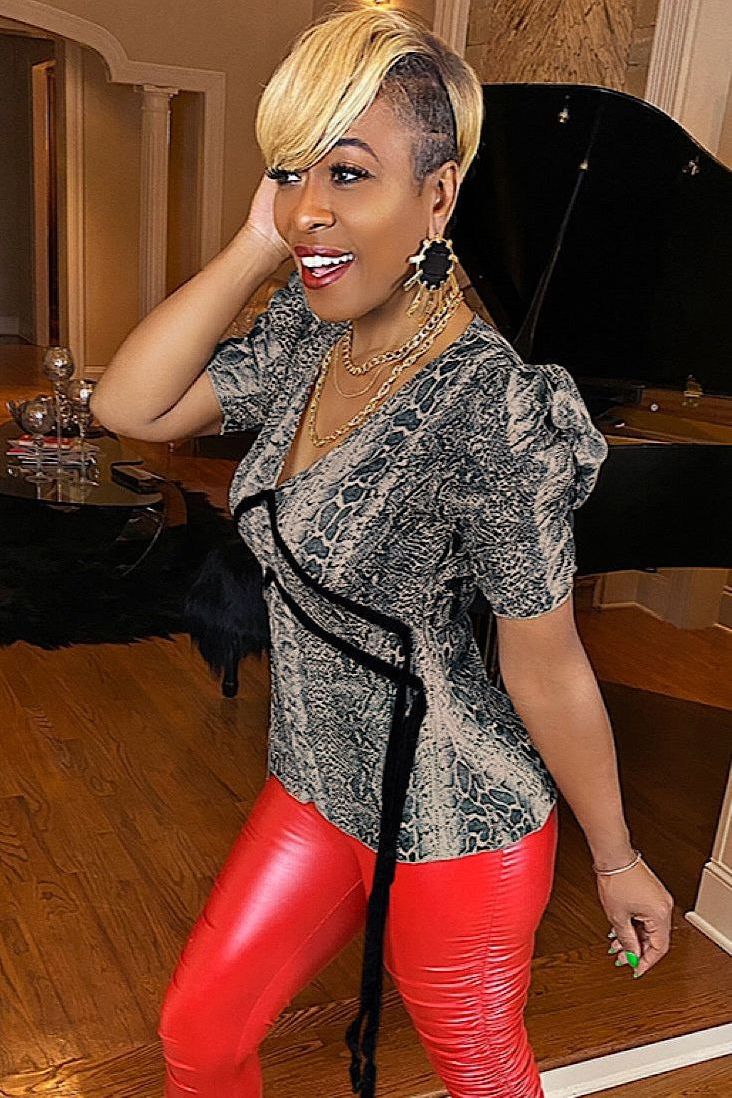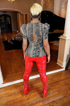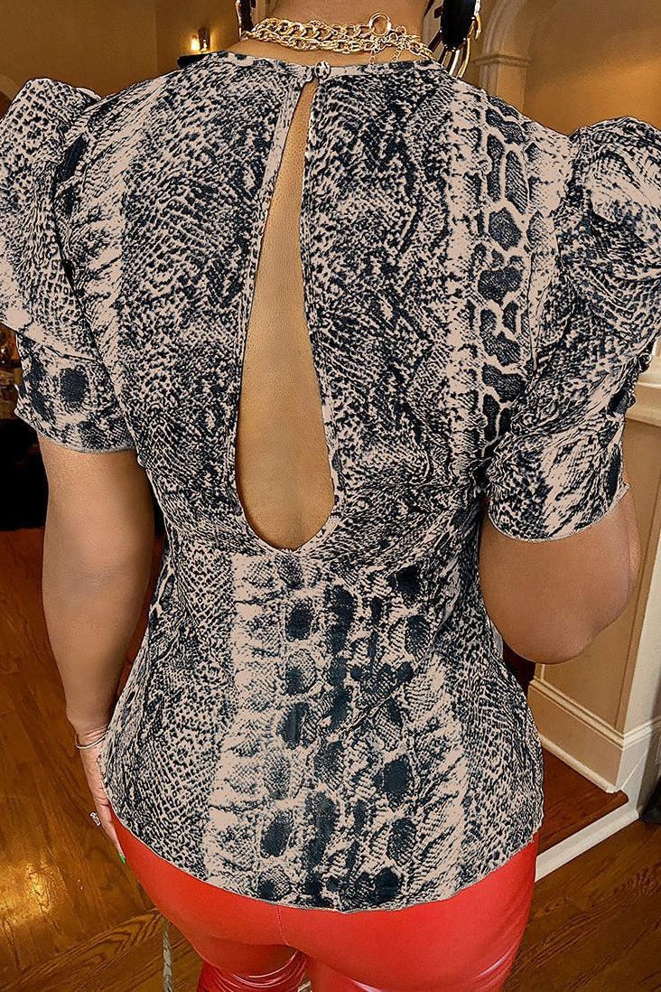 It’s semi-sheer, with a snake print...meet our Sneak Snake Top. Get into our puffy sleeve top with handing string details.