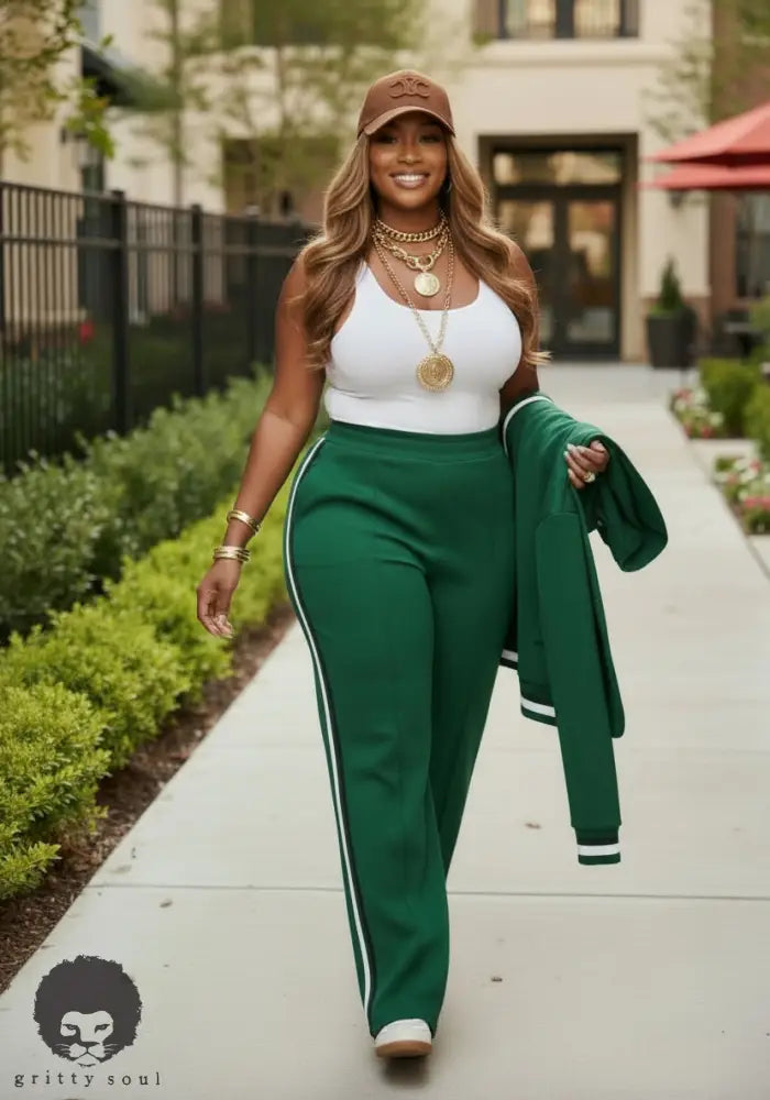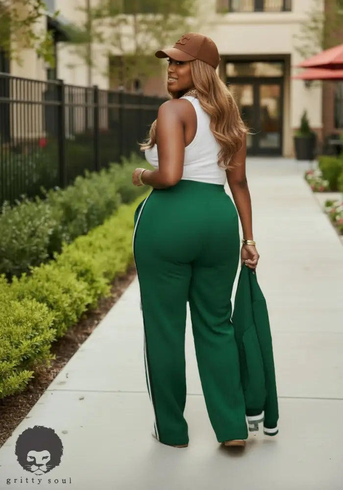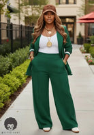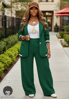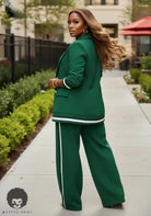 The Street Legal Power Set brings that clean, effortless confidence — the kind that moves with you from errands to elevation. This soft-tailored two-piece features a relaxed blazer with sporty stripe accents, ruched sleeves, and an easy drape that gives voguish, grown-woman energy without trying too hard. The matching wide-leg pants flow with a smooth, lightweight finish, detailed with coordinating side stripes for a polished, street-ready vibe. Pair it with your favorite bodysuit or tank and step out certified stylish on any block.