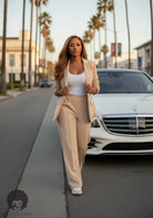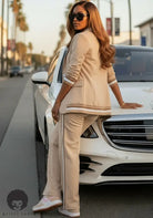 The Street Legal Power Set brings that clean, effortless confidence — the kind that moves with you from errands to elevation. This soft-tailored two-piece features a relaxed blazer with sporty stripe accents, ruched sleeves, and an easy drape that gives voguish, grown-woman energy without trying too hard. The matching wide-leg pants flow with a smooth, lightweight finish, detailed with coordinating side stripes for a polished, street-ready vibe. Pair it with your favorite bodysuit or tank and step out certified stylish on any block.