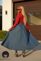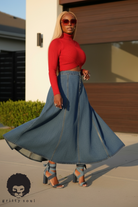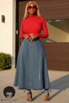 The Supa Flare Denim Skirt serves high-volume elegance with a touch of retro sass. This high-rise maxi skirt moves like a dream — featuring a flattering button-front closure, soft structured denim, and dramatic flare from waist to hem. Whether styled with a tucked sweater or cropped top, it’s your go-to for that soft-yet-statement vibe.