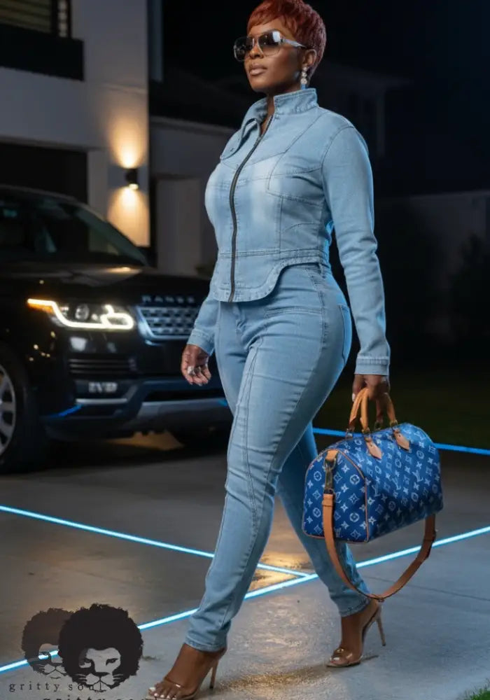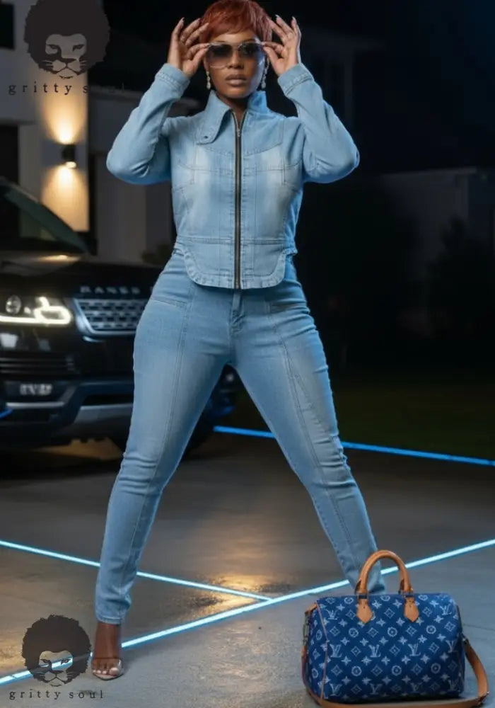 The Tamika Curve Denim Set serves sculpt and edge in one easy fit. A zip-up, curve-skimming denim jacket with a sleek mock-neck pairs with ankle-length skinny jeans that contour the legs with flattering seam work. Light-wash stretch denim moves with you, while subtle fading and the curved hem snatch the waist for a made-to-measure vibe. Dress it up with heels or keep it street with fresh sneakers—either way, it’s giving grown-woman energy.