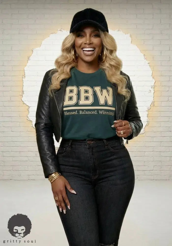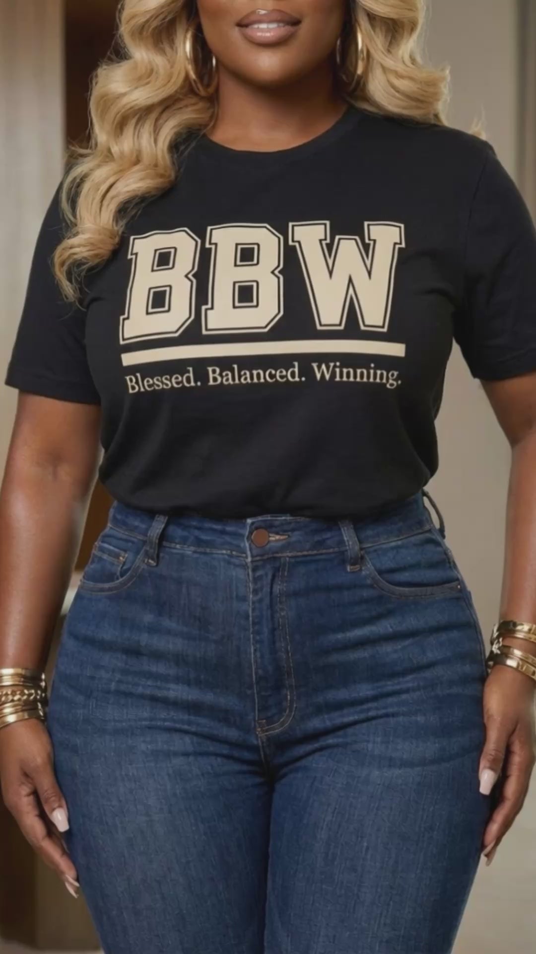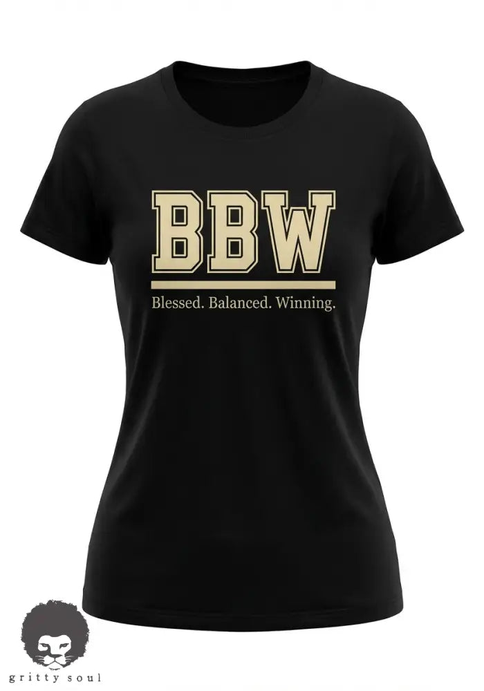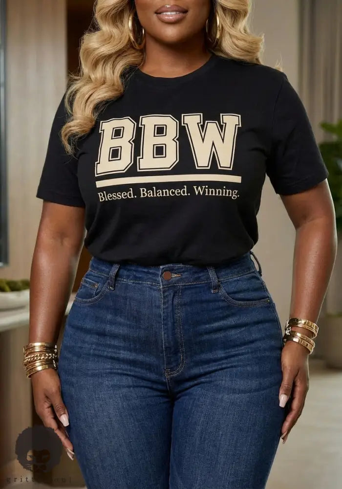 Featuring strong varsity-inspired typography and the empowering message Blessed. Balanced. Winning., this graphic hits different. It’s calm confidence. Grown-woman energy. Everyday wearable power.