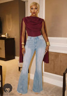 The Thelma Evanz Bell Bottoms are that grown-woman denim that knows exactly what it’s doing. Designed with a high-rise waist and a curve-contouring fit through the hips and thighs, these washed denim bell bottoms flare out just below the knee for a bold, leg-lengthening silhouette. The micro-elastic stretch gives you structure with comfort, while the dramatic wide-leg finish brings all the pressure—day or night.