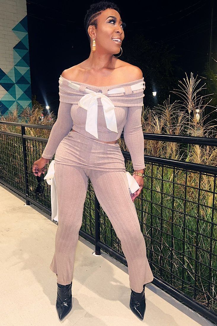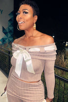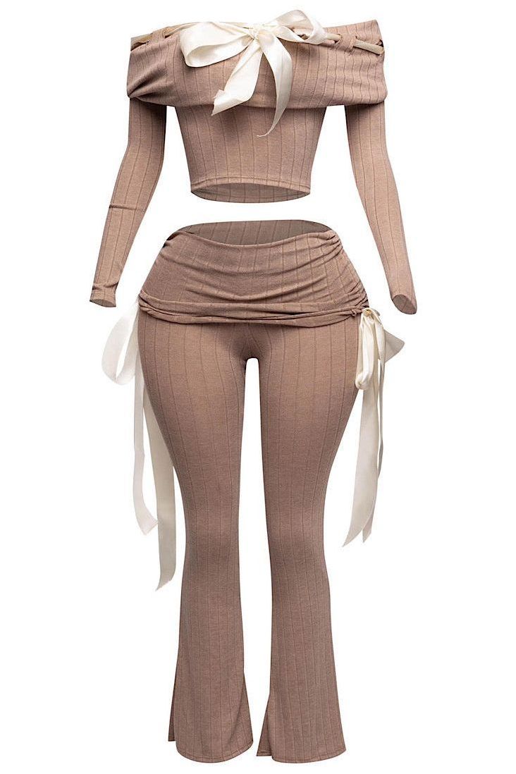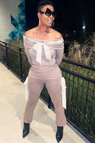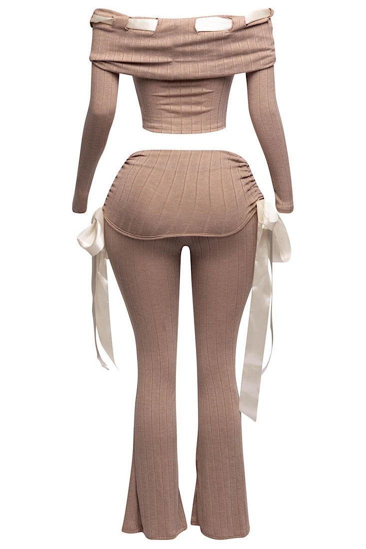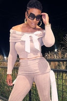 Get ready to turn heads with the Wrapped in Ribbons Set, a two-piece ensemble that brings a touch of sophistication and flirtiness to your wardrobe. This set features a ribbed, off-shoulder crop top adorned with a delicate satin ribbon detail and matching high-waisted pants with side ribbon accents. Perfect for nights out, special occasions, or just when you want to feel wrapped up in a little extra luxe.